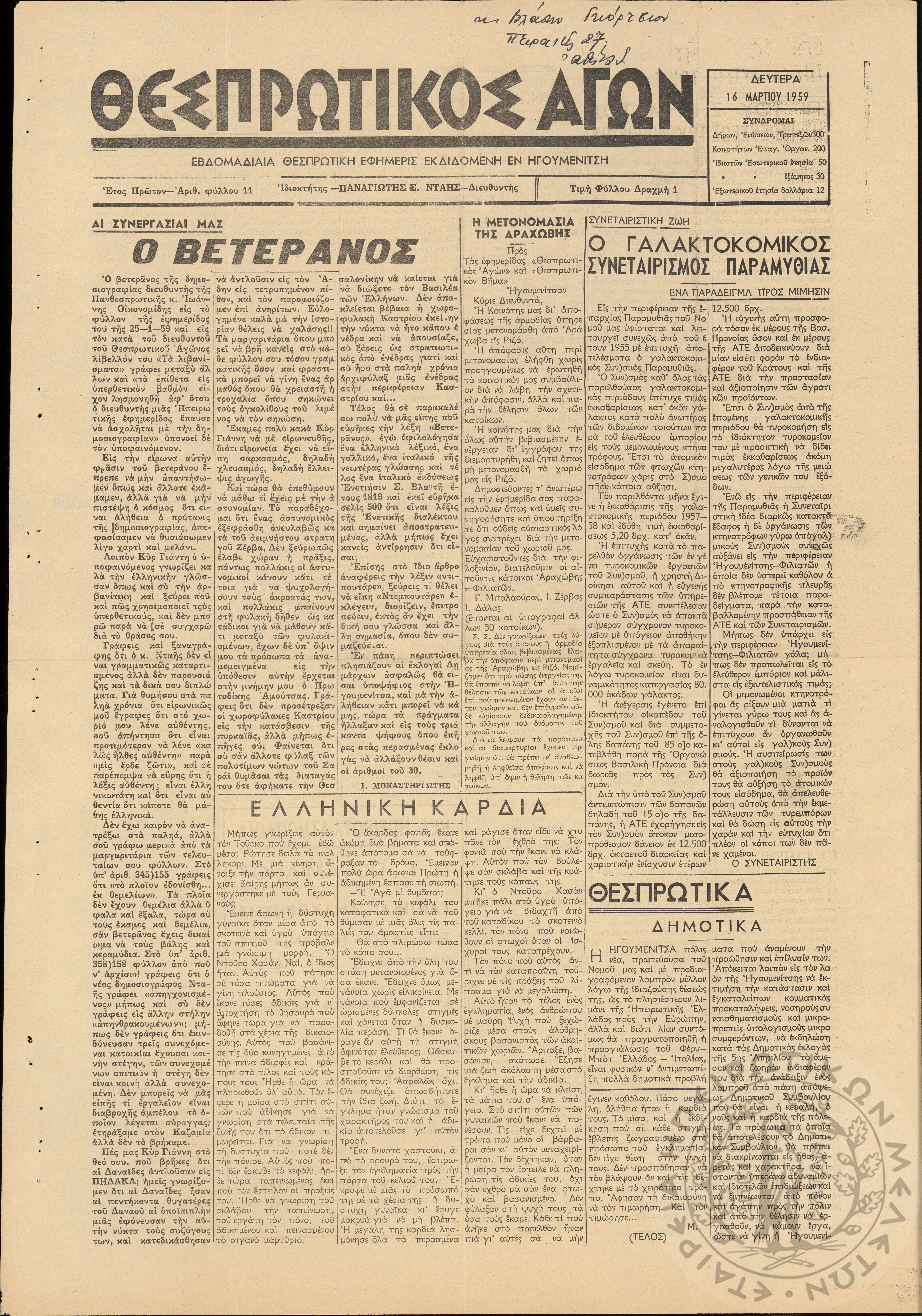 Θεσπρωτικός Αγών: εβδομαδιαία Θεσπρωτική εφημερίς εκδιδομένη εν Ηγουμενίτση, 1959, φ. 11Έτος Α΄, φ. 11...