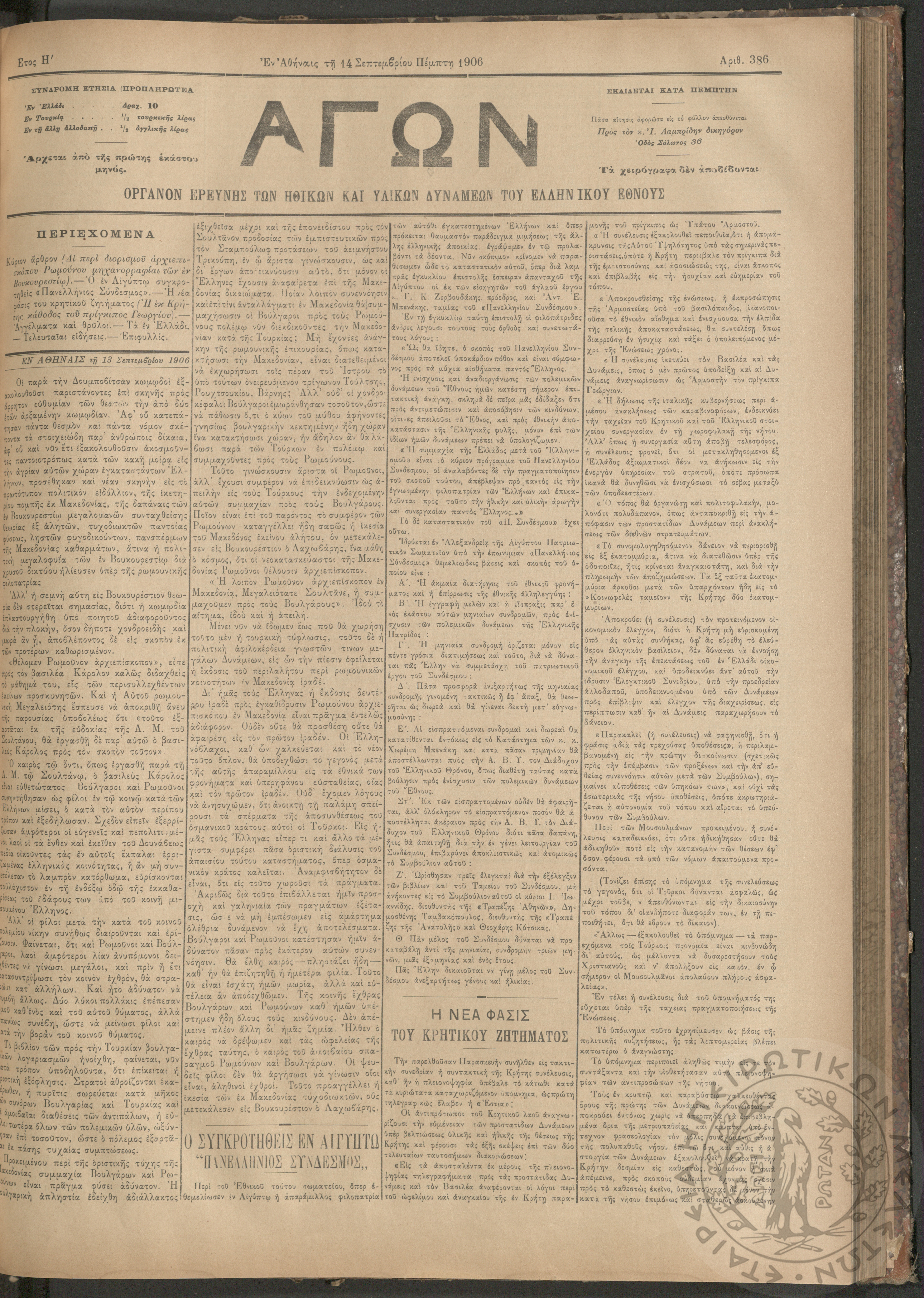 Αγών: Όργανον ερεύνης των ηθικών και υλικών δυνάμεων του Ελληνικού Έθνους, 1906 (Φ. 386)Έτος Η΄, Φ. 386...