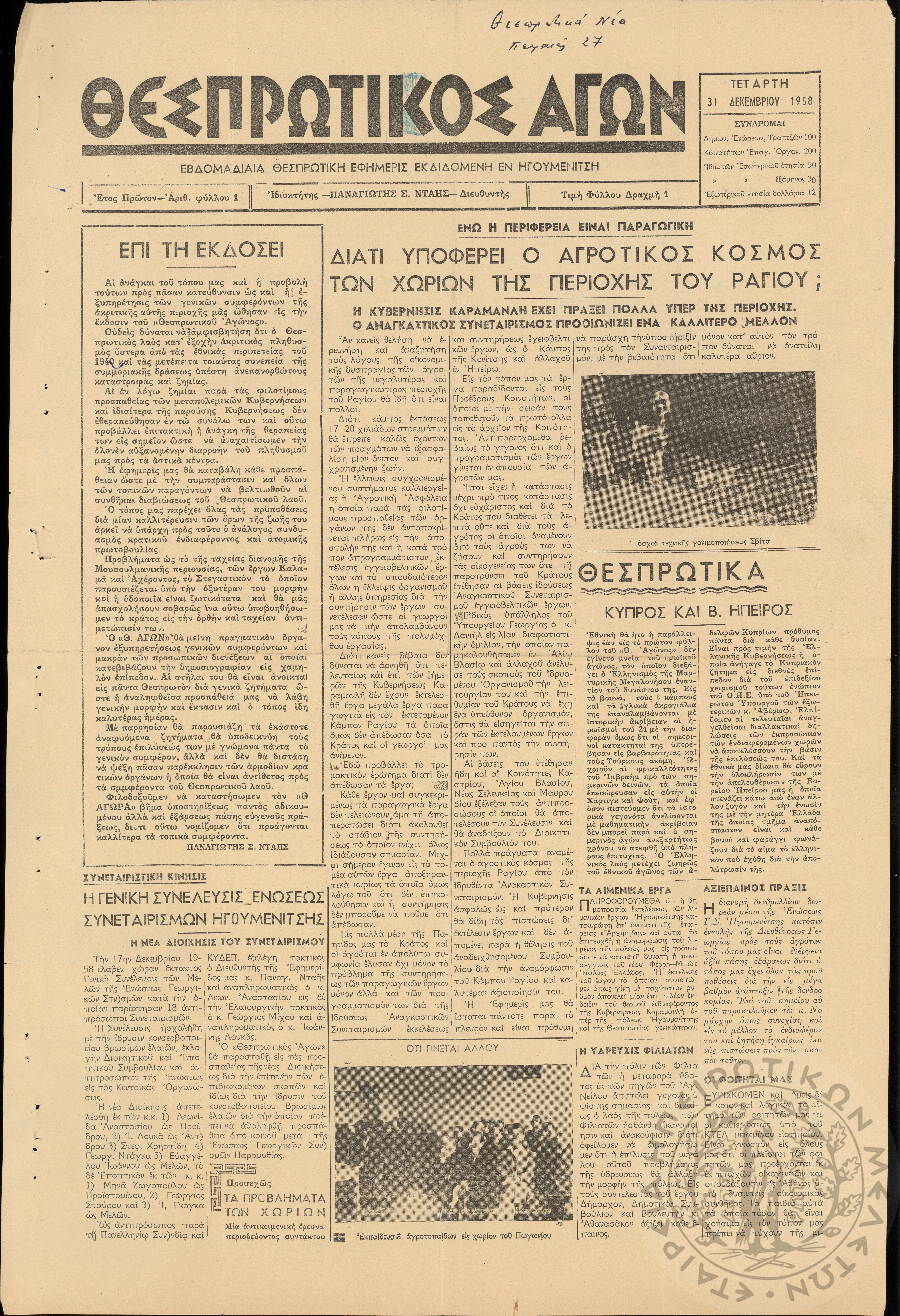 Θεσπρωτικός Αγών: εβδομαδιαία Θεσπρωτική εφημερίς εκδιδομένη εν Ηγουμενίτση, 1958, φ. 1Έτος Α΄, φ. 1...