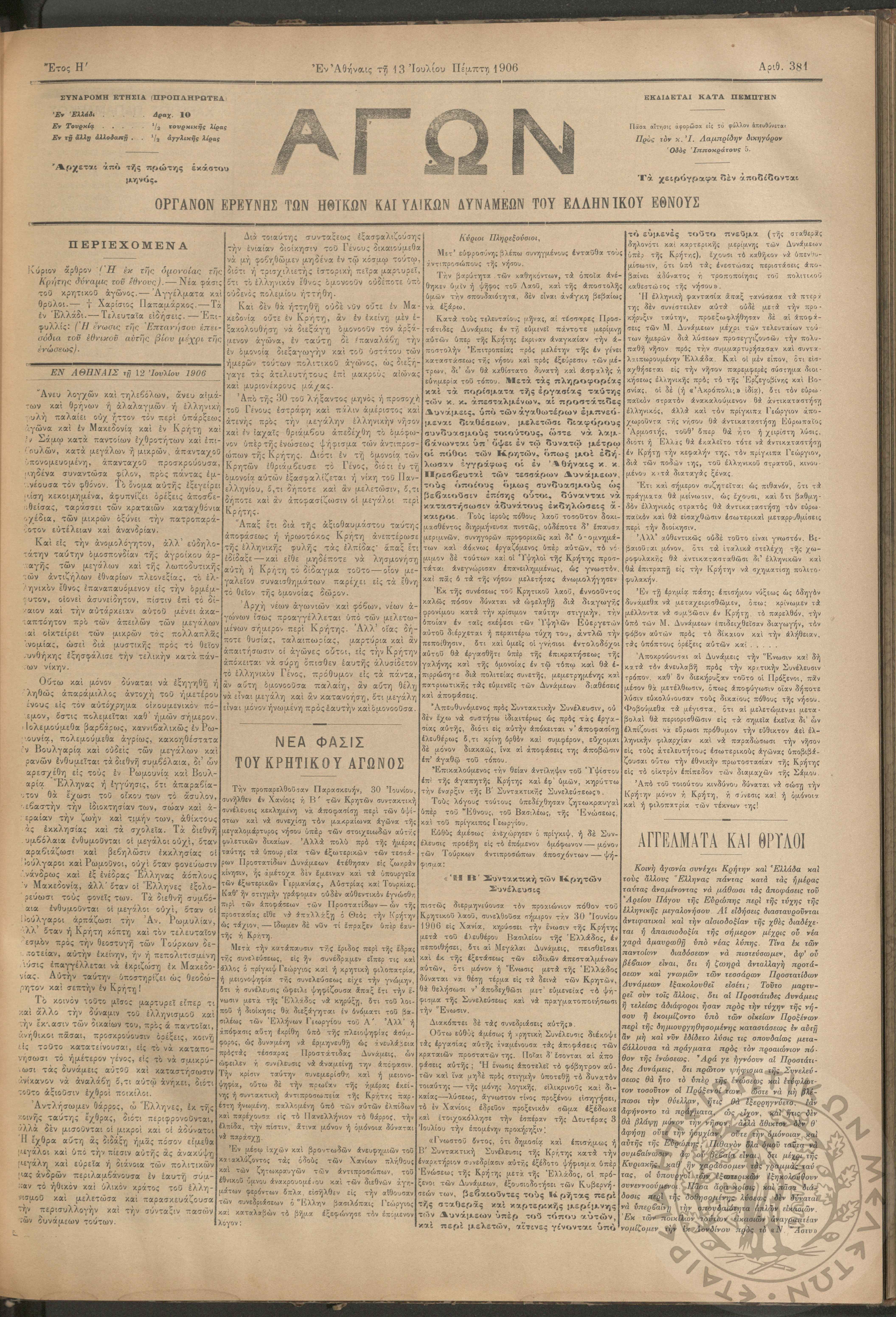 Αγών: Όργανον ερεύνης των ηθικών και υλικών δυνάμεων του Ελληνικού Έθνους, 1906 (Φ. 381)Έτος Η΄, Φ. 381...