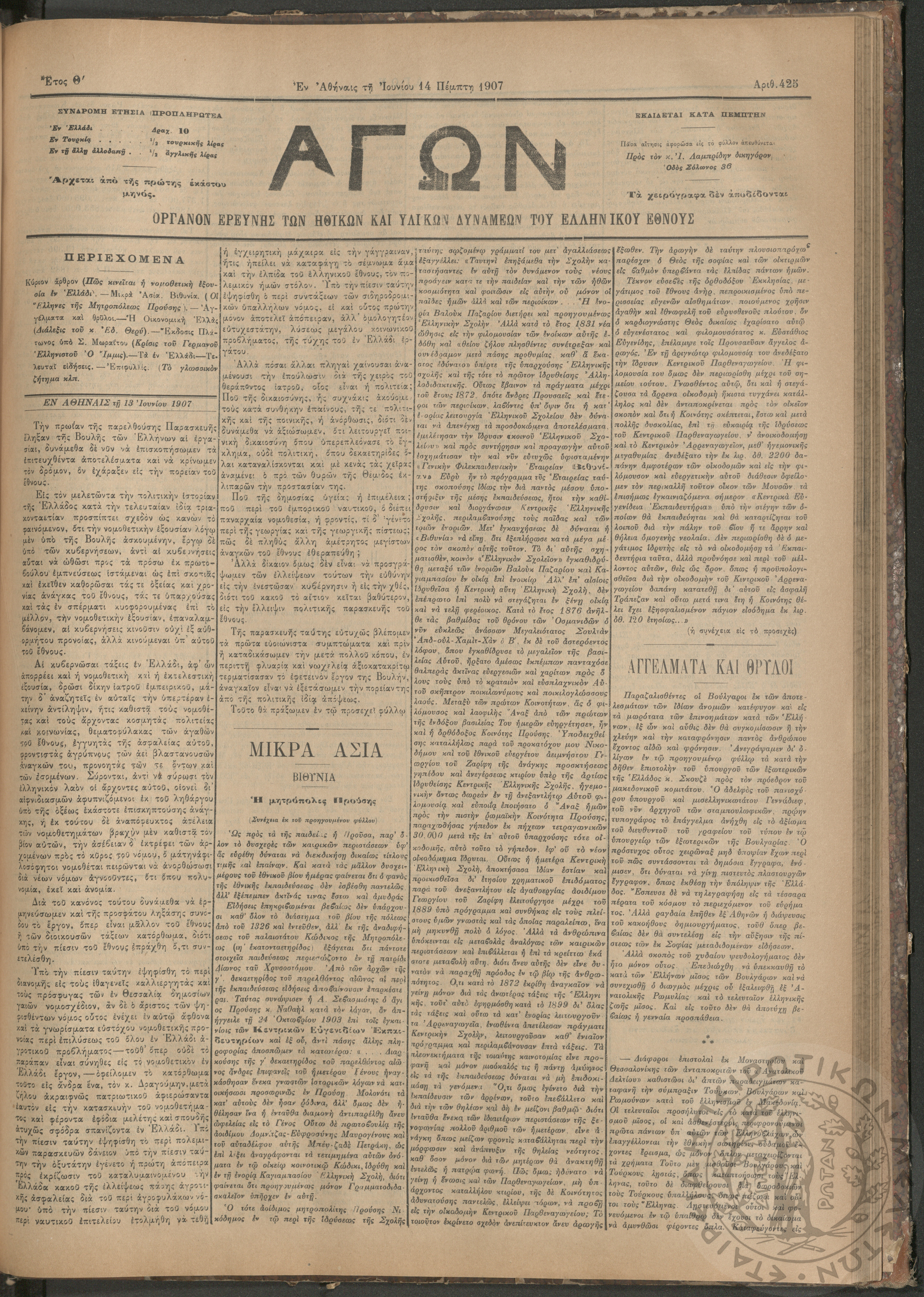 Αγών: Όργανον ερεύνης των ηθικών και υλικών δυνάμεων του Ελληνικού Έθνους, 1907 (Φ. 425)Έτος Θ΄, Φ. 425...