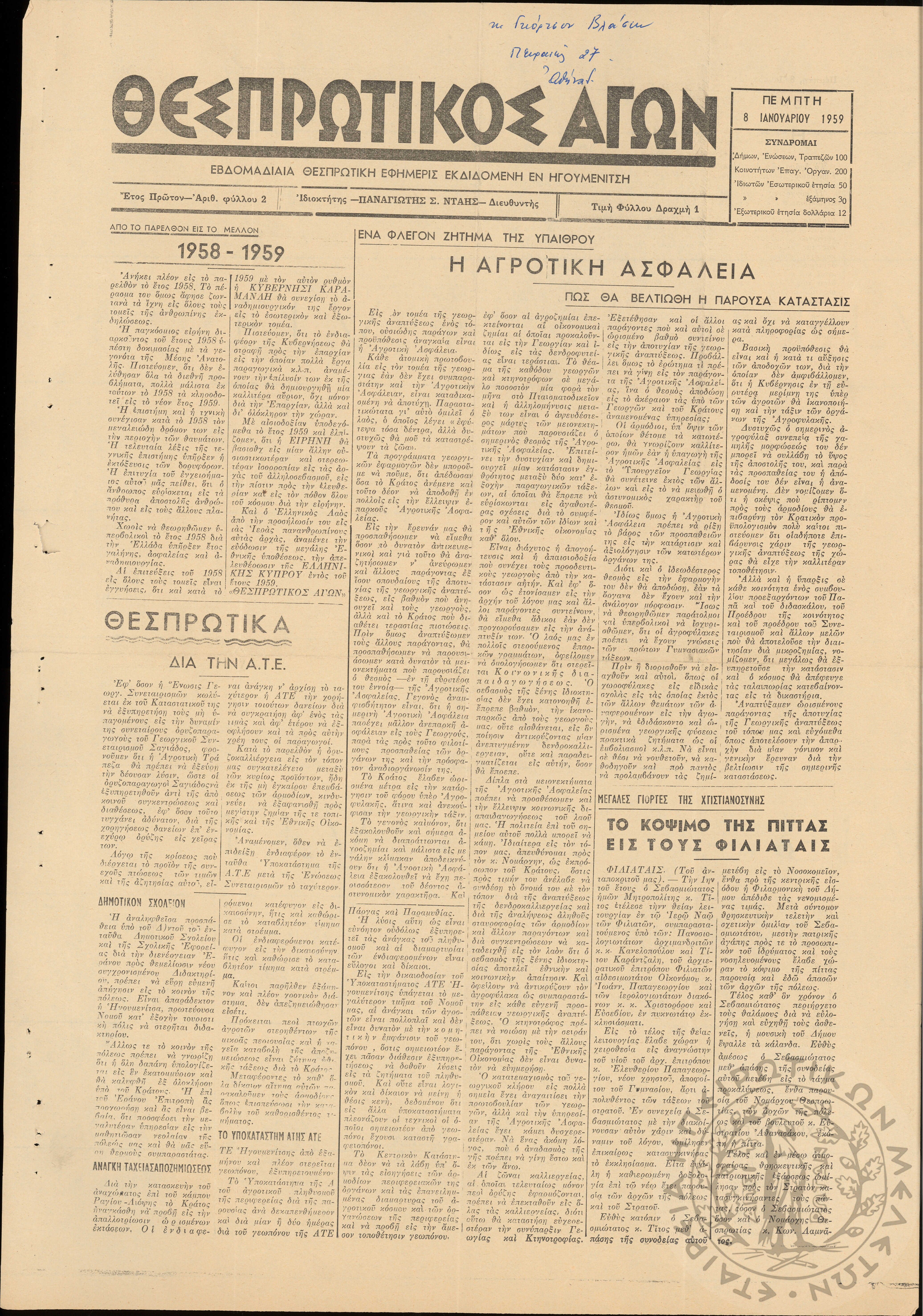 Θεσπρωτικός Αγών: εβδομαδιαία Θεσπρωτική εφημερίς εκδιδομένη εν Ηγουμενίτση, 1959, φ. 2Έτος Α΄, φ. 2...