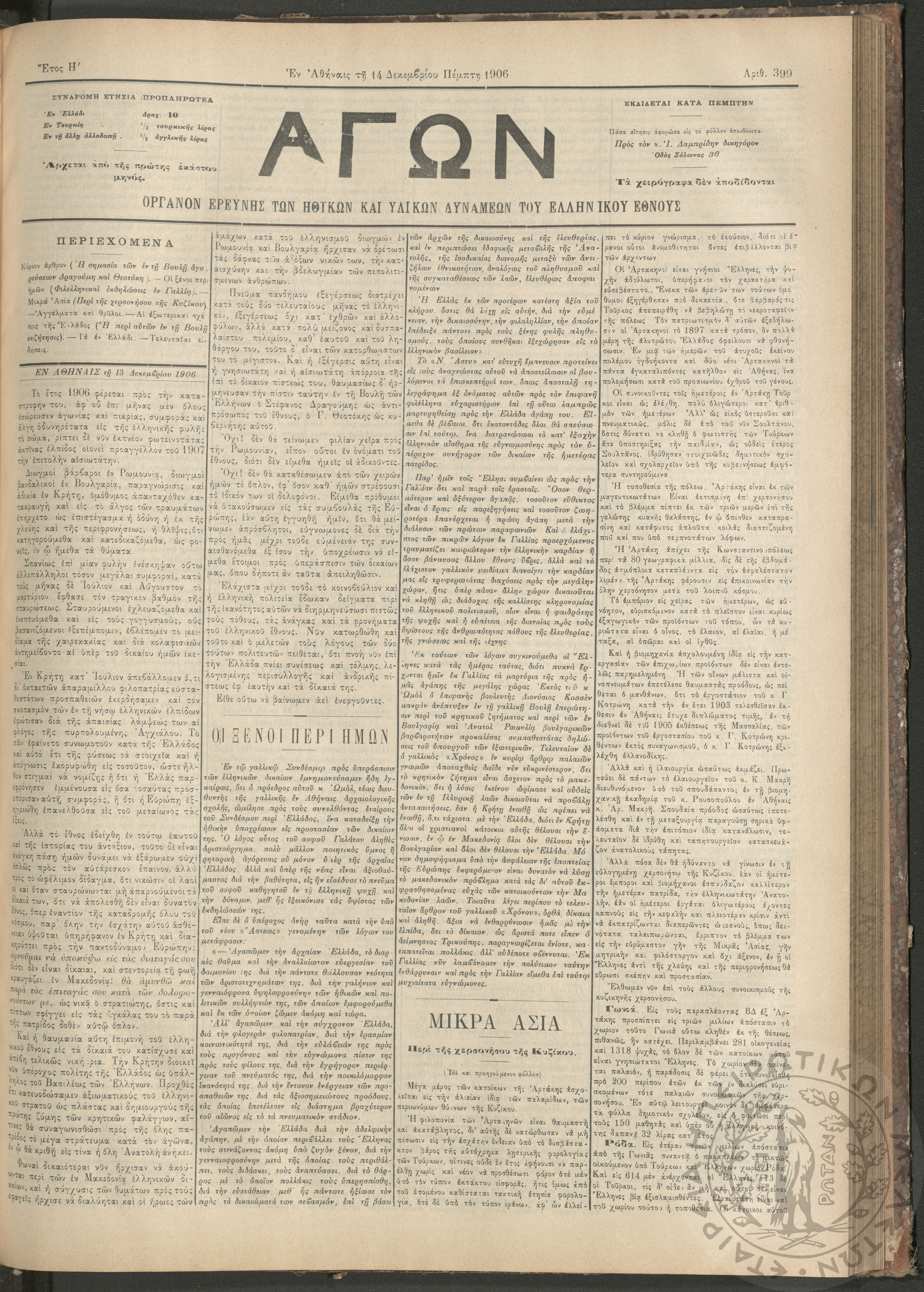 Αγών: Όργανον ερεύνης των ηθικών και υλικών δυνάμεων του Ελληνικού Έθνους, 1906 (Φ. 399)Έτος Η΄, Φ.399...