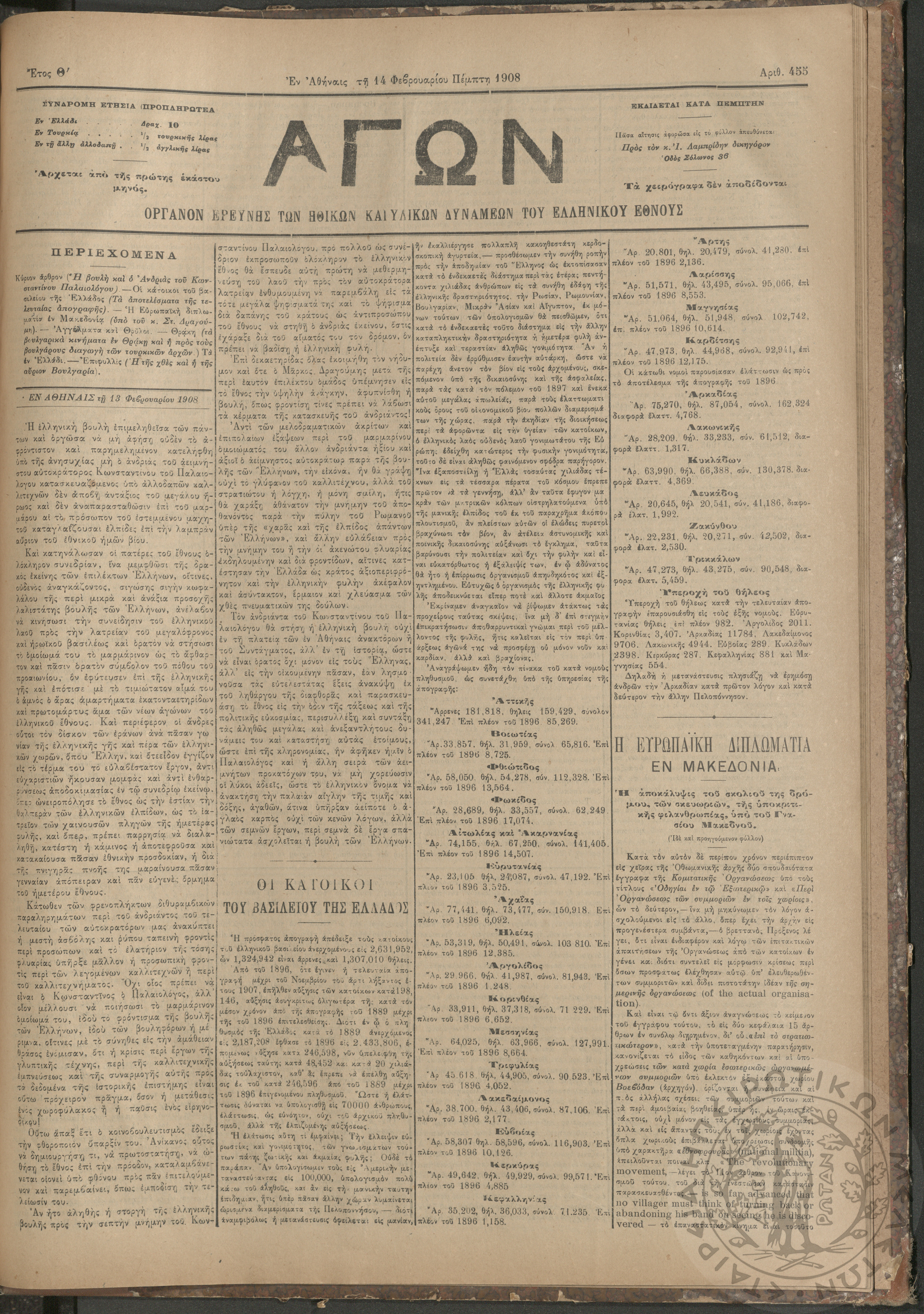 Αγών: Όργανον ερεύνης των ηθικών και υλικών δυνάμεων του Ελληνικού Έθνους, 1908 (Φ. 455)Έτος Θ΄, Φ.455...