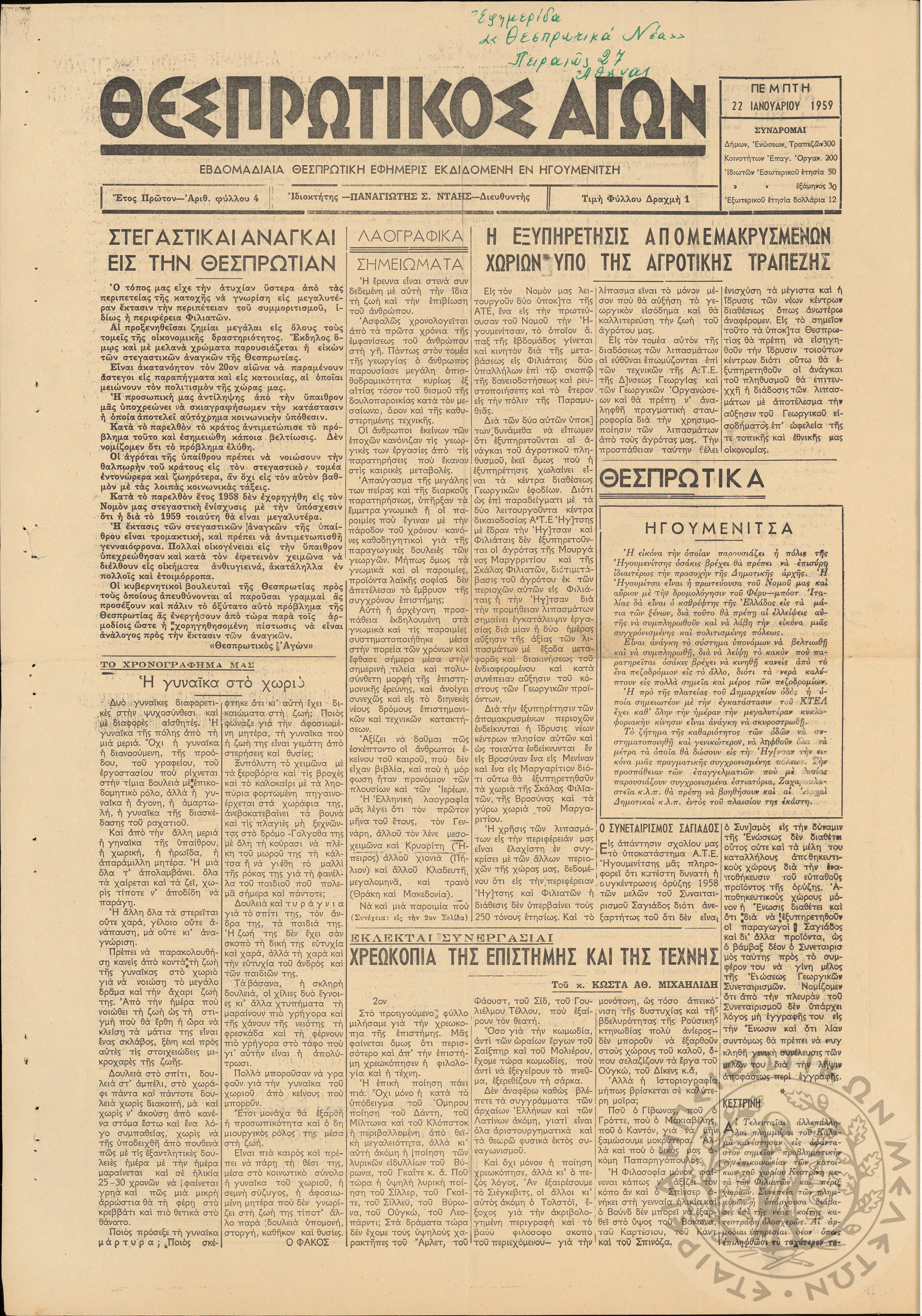 Θεσπρωτικός Αγών: εβδομαδιαία Θεσπρωτική εφημερίς εκδιδομένη εν Ηγουμενίτση, 1959, φ. 4Έτος Α΄, φ. 4...