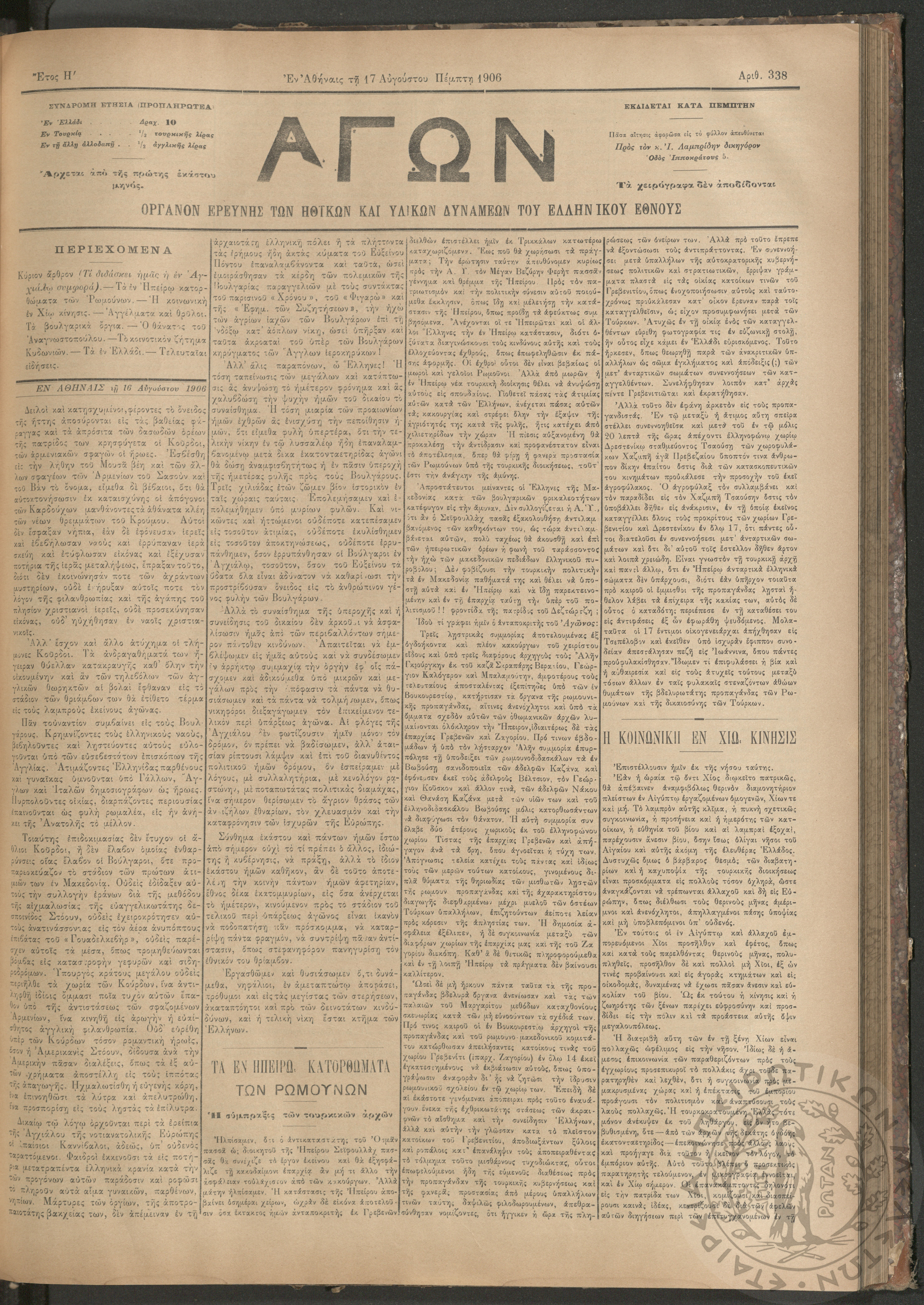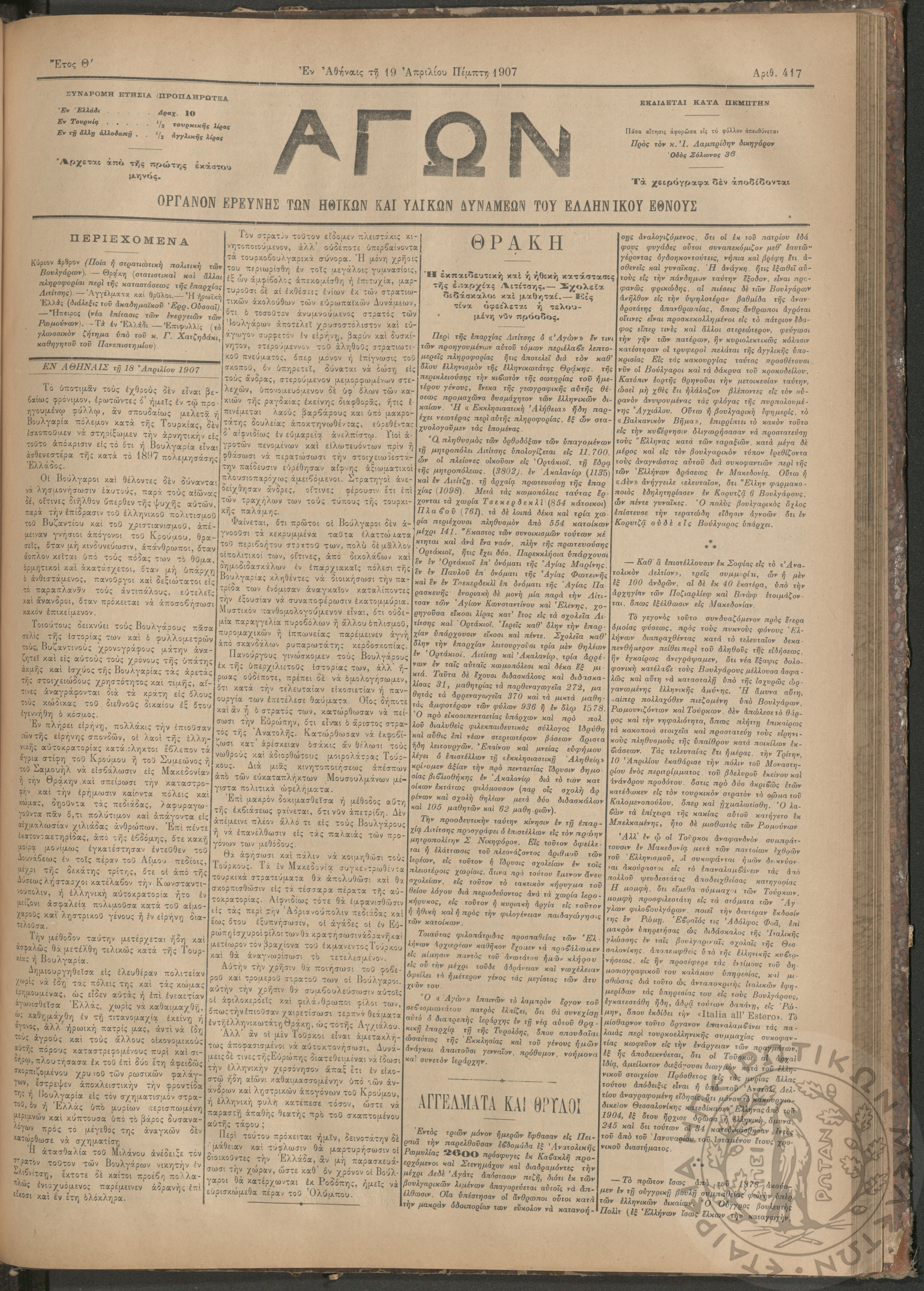 Αγών: Όργανον ερεύνης των ηθικών και υλικών δυνάμεων του Ελληνικού Έθνους, 1907 (Φ. 417)Έτος Θ΄, Φ. 417...