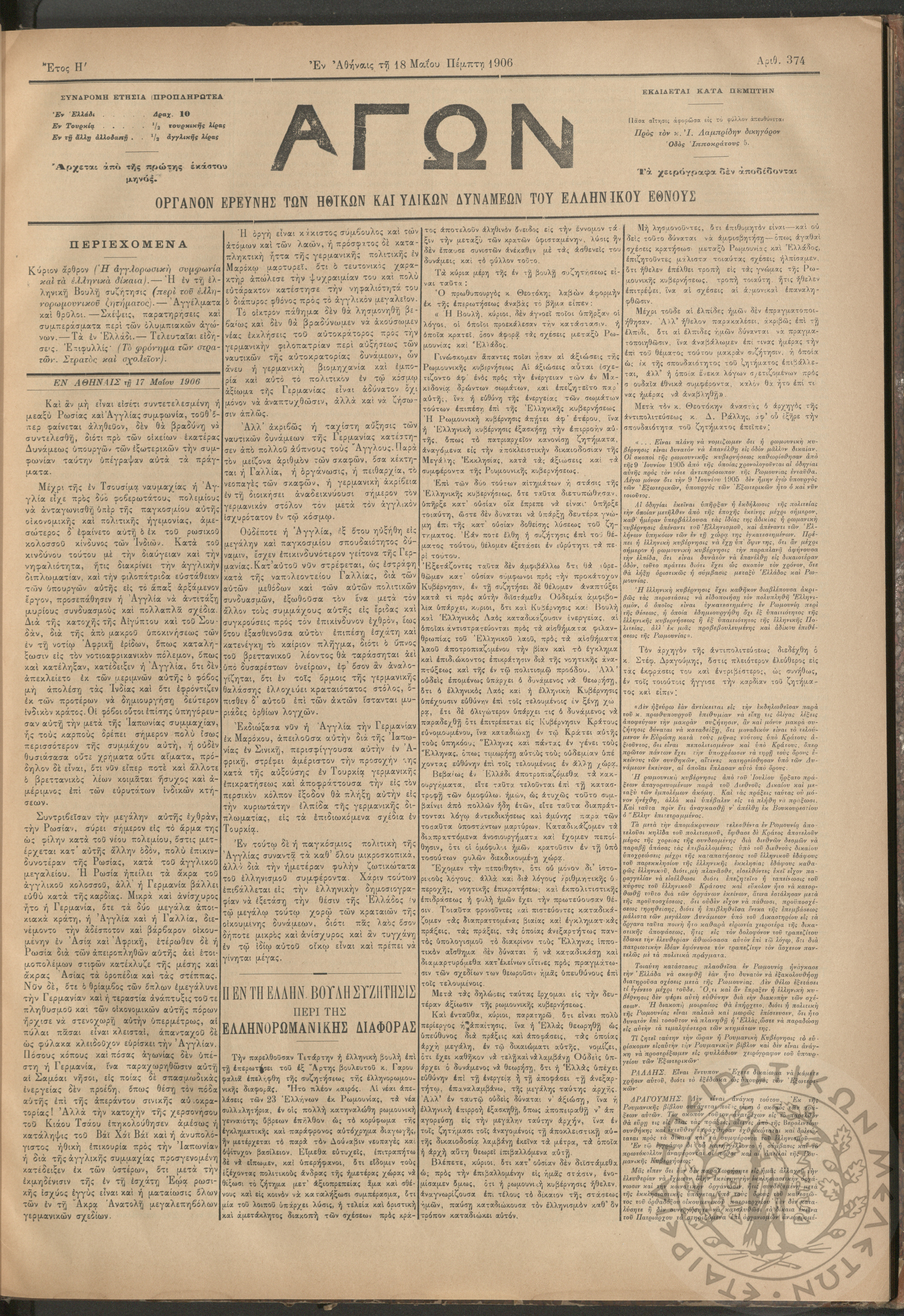 Αγών: Όργανον ερεύνης των ηθικών και υλικών δυνάμεων του Ελληνικού Έθνους, 1906 (Φ. 374)Έτος Η΄, Φ. 374...