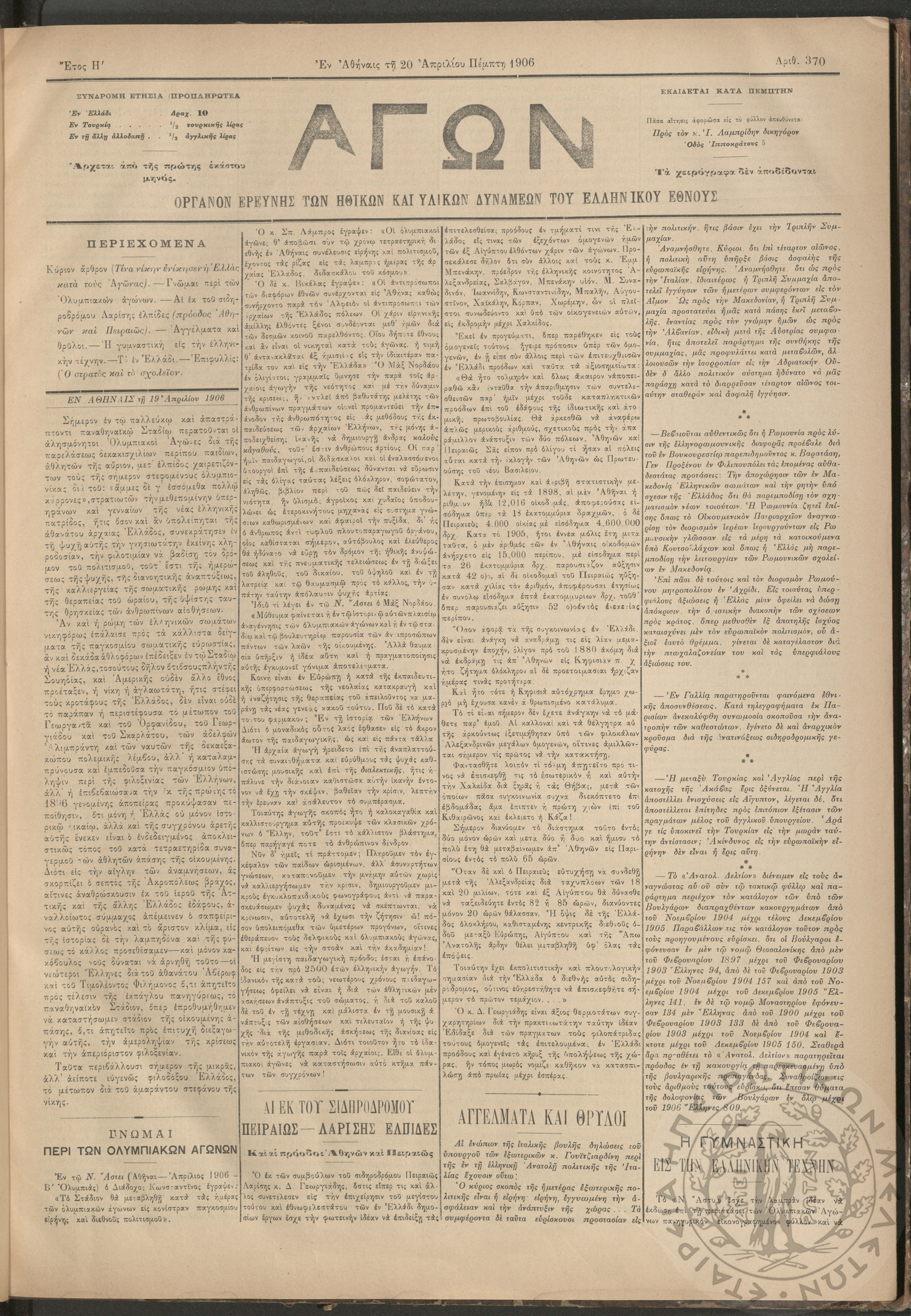 Αγών: Όργανον ερεύνης των ηθικών και υλικών δυνάμεων του Ελληνικού Έθνους, 1906 (Φ. 370)Έτος Η΄, Φ. 370...