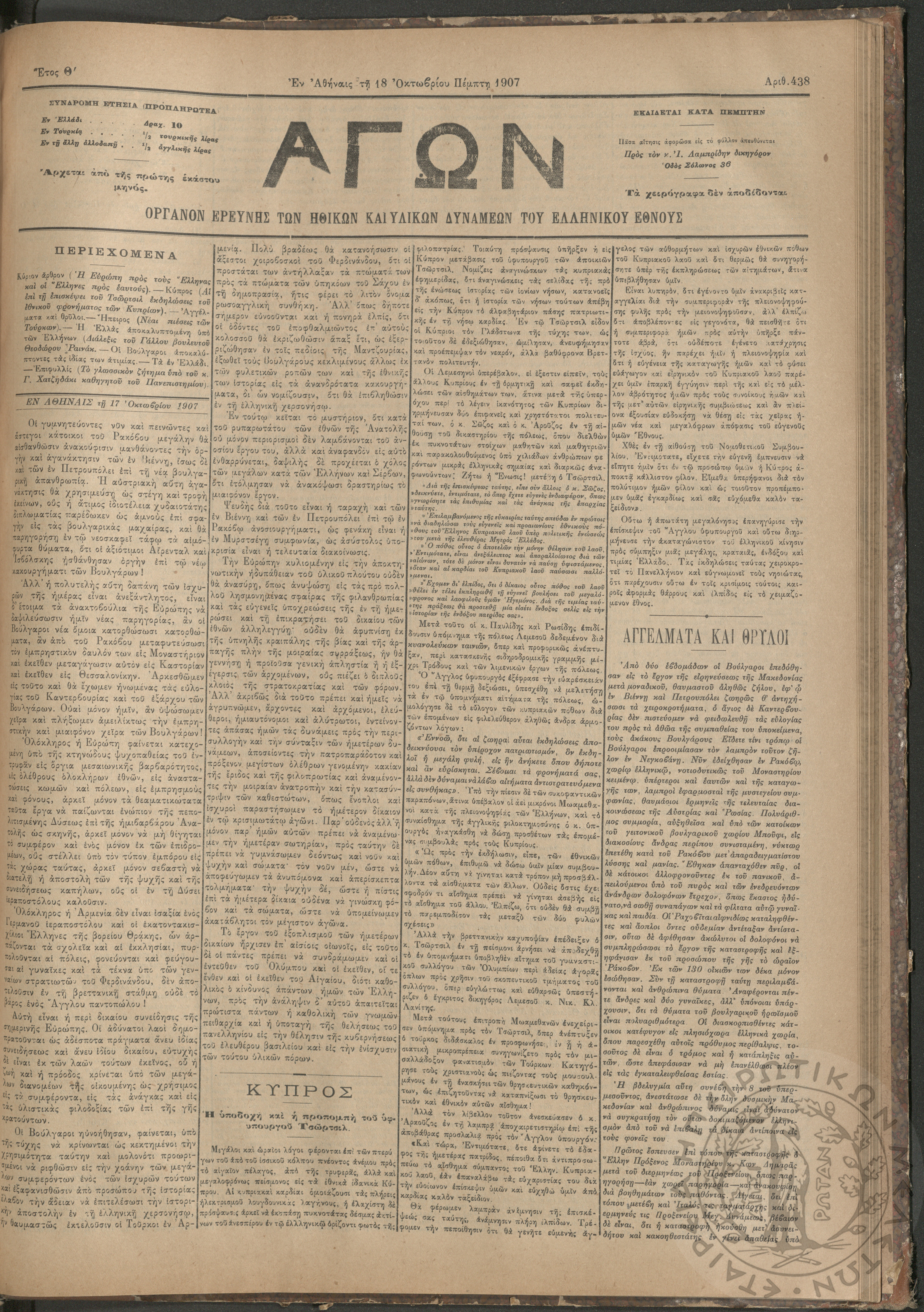 Αγών: Όργανον ερεύνης των ηθικών και υλικών δυνάμεων του Ελληνικού Έθνους, 1907 (Φ. 438)Έτος Θ΄, Φ. 438...