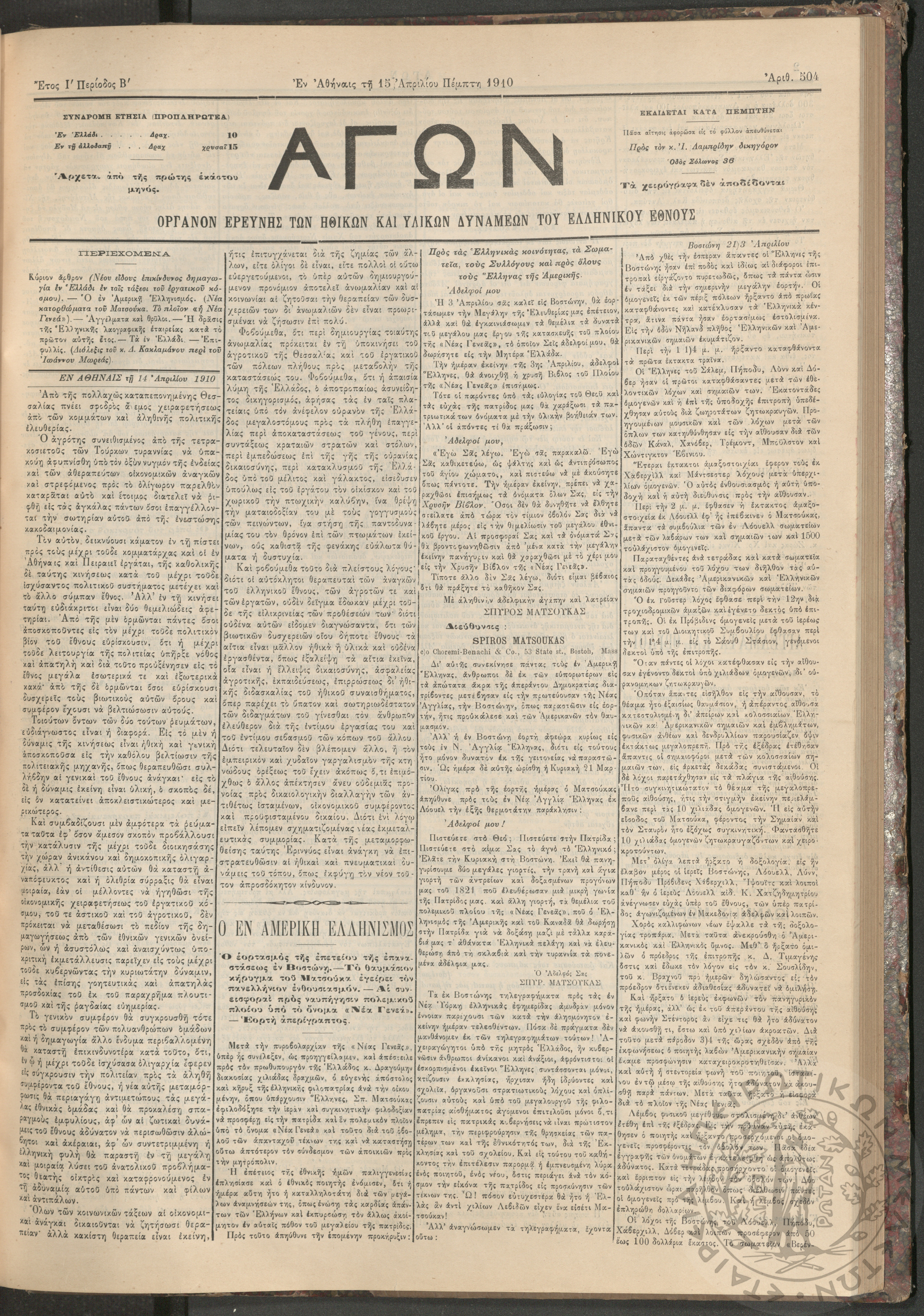 Αγών: Όργανον ερεύνης των ηθικών και υλικών δυνάμεων του Ελληνικού Έθνους, 1910 (Φ. 504)Έτος Ι΄, Φ. 504...