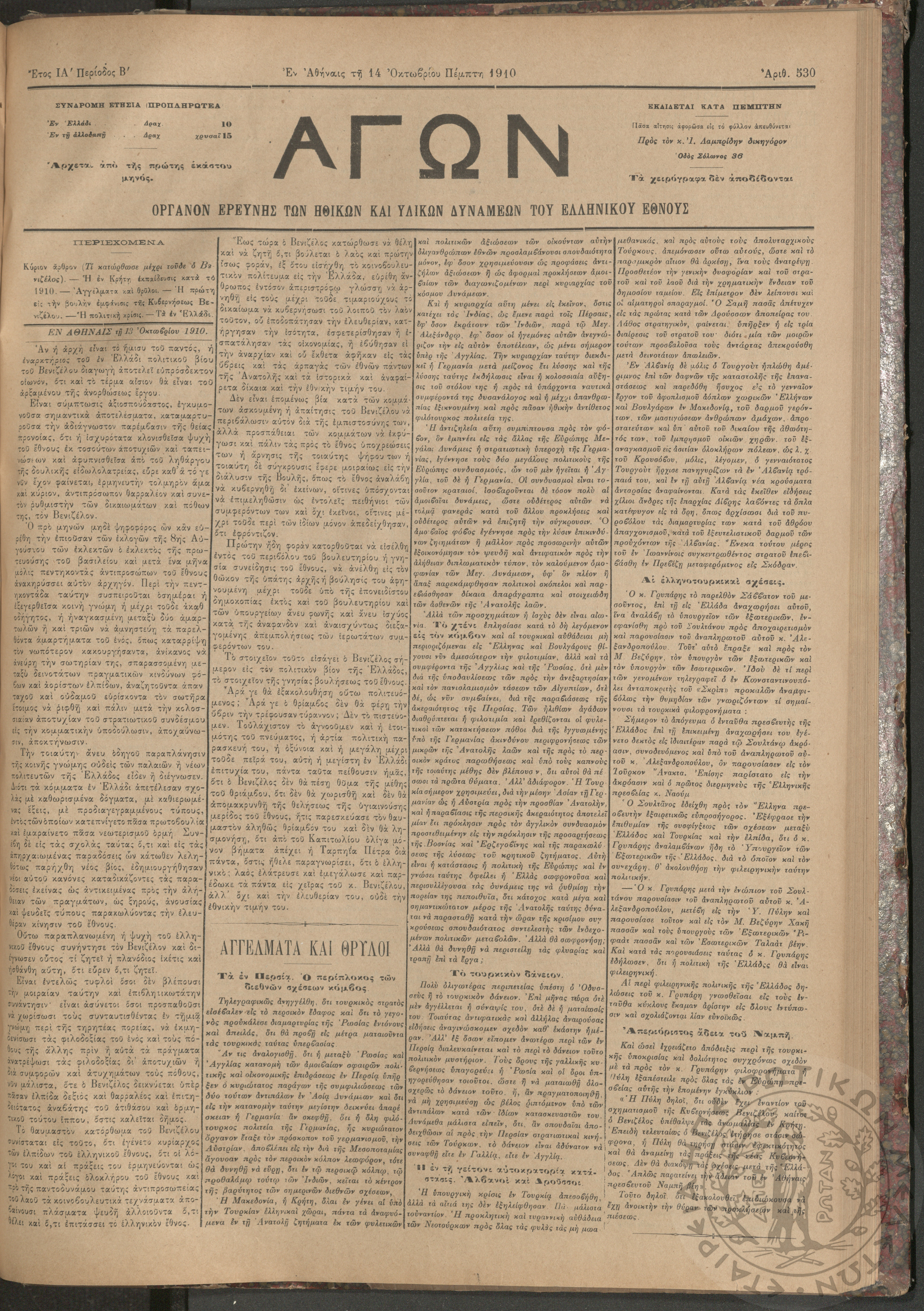 Αγών: Όργανον ερεύνης των ηθικών και υλικών δυνάμεων του Ελληνικού Έθνους, 1910 (Φ. 530)Έτος ΙΑ΄, Φ. 530...