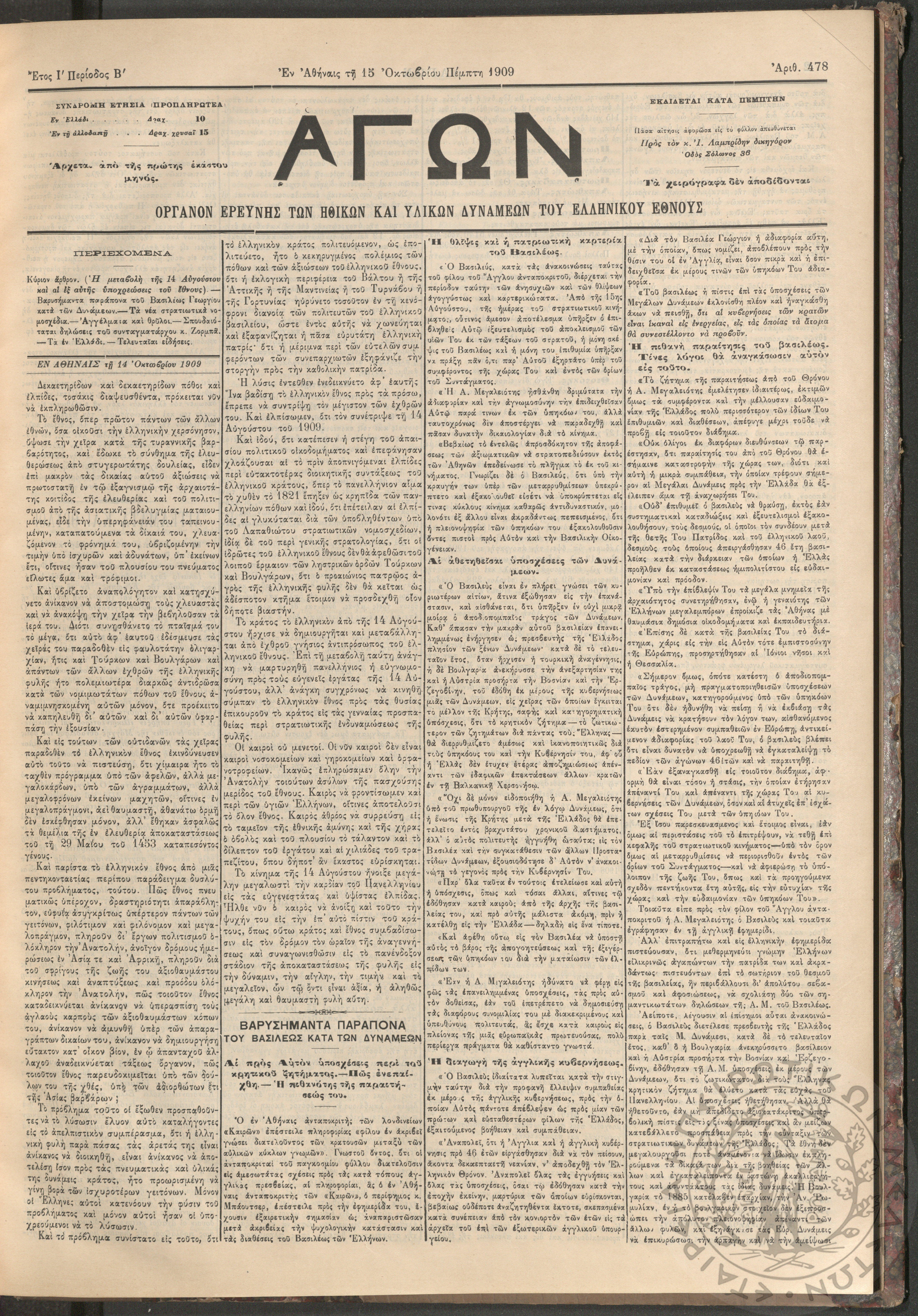 Αγών: Όργανον ερεύνης των ηθικών και υλικών δυνάμεων του Ελληνικού Έθνους, 1909 (Φ. 478)Έτος Ι΄, Φ. 478...