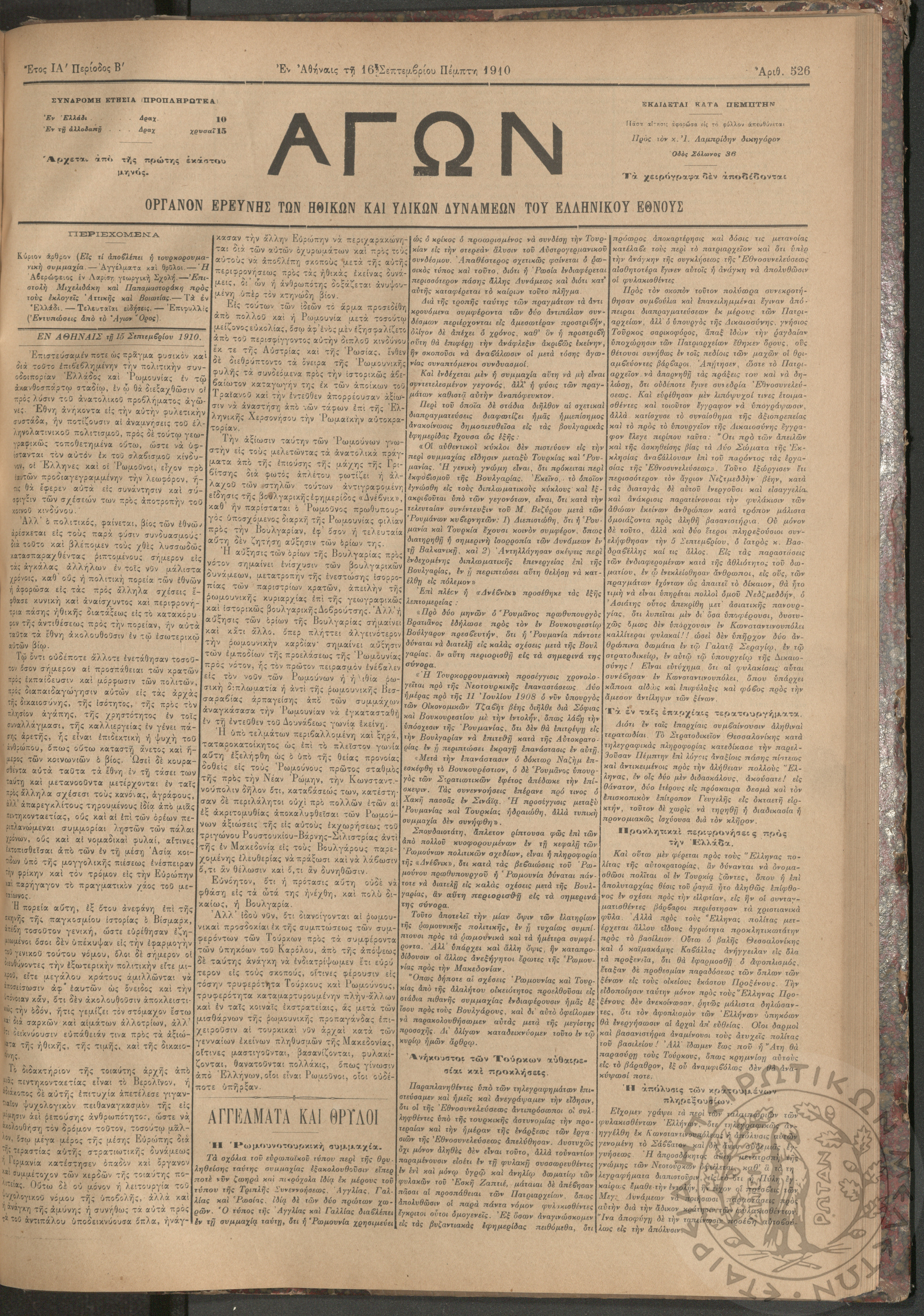 Αγών: Όργανον ερεύνης των ηθικών και υλικών δυνάμεων του Ελληνικού Έθνους, 1910 (Φ. 526)Έτος ΙΑ΄, Φ. 526...