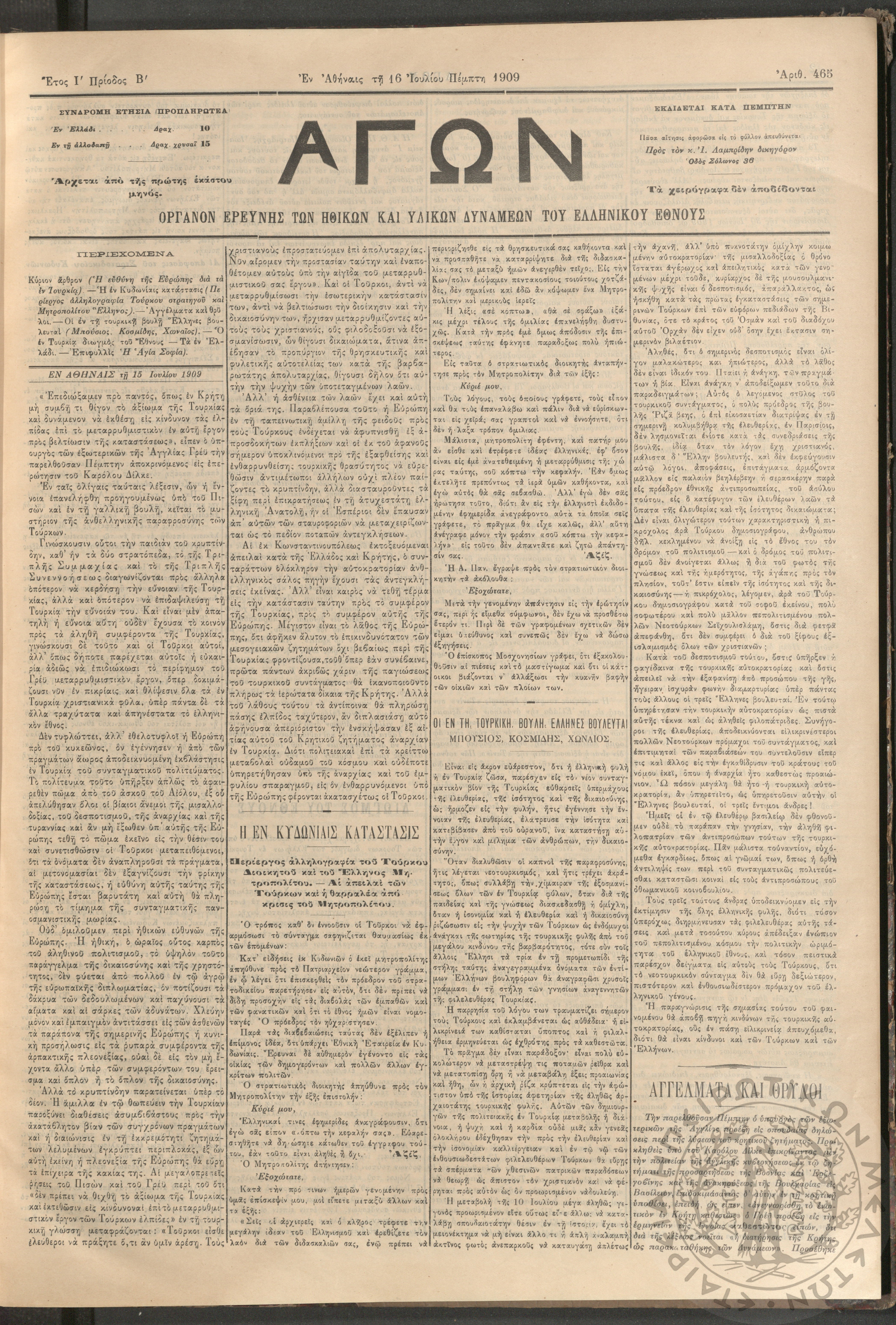 Αγών: Όργανον ερεύνης των ηθικών και υλικών δυνάμεων του Ελληνικού Έθνους, 1909 (Φ. 465)Έτος Ι΄, Φ. 465...