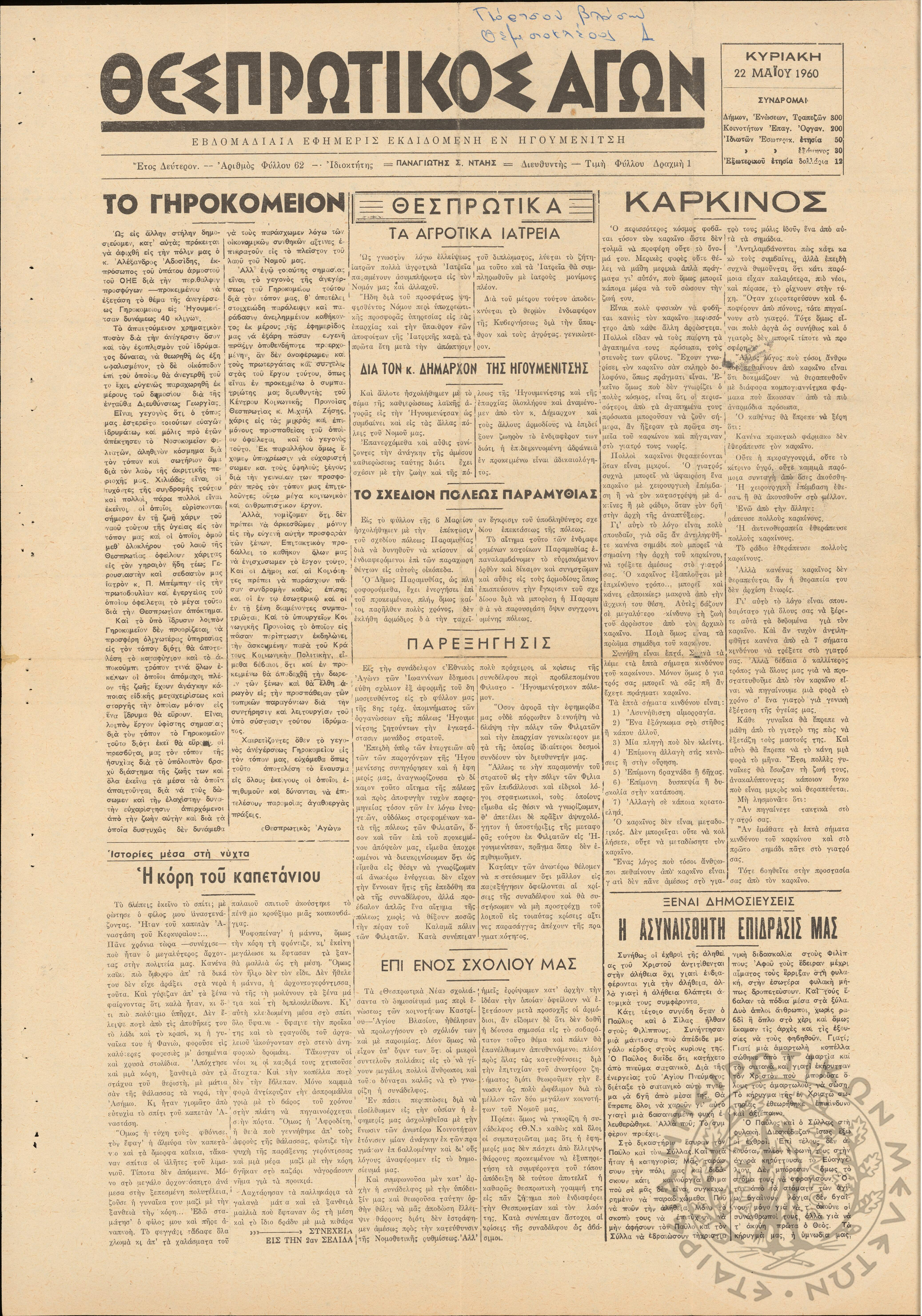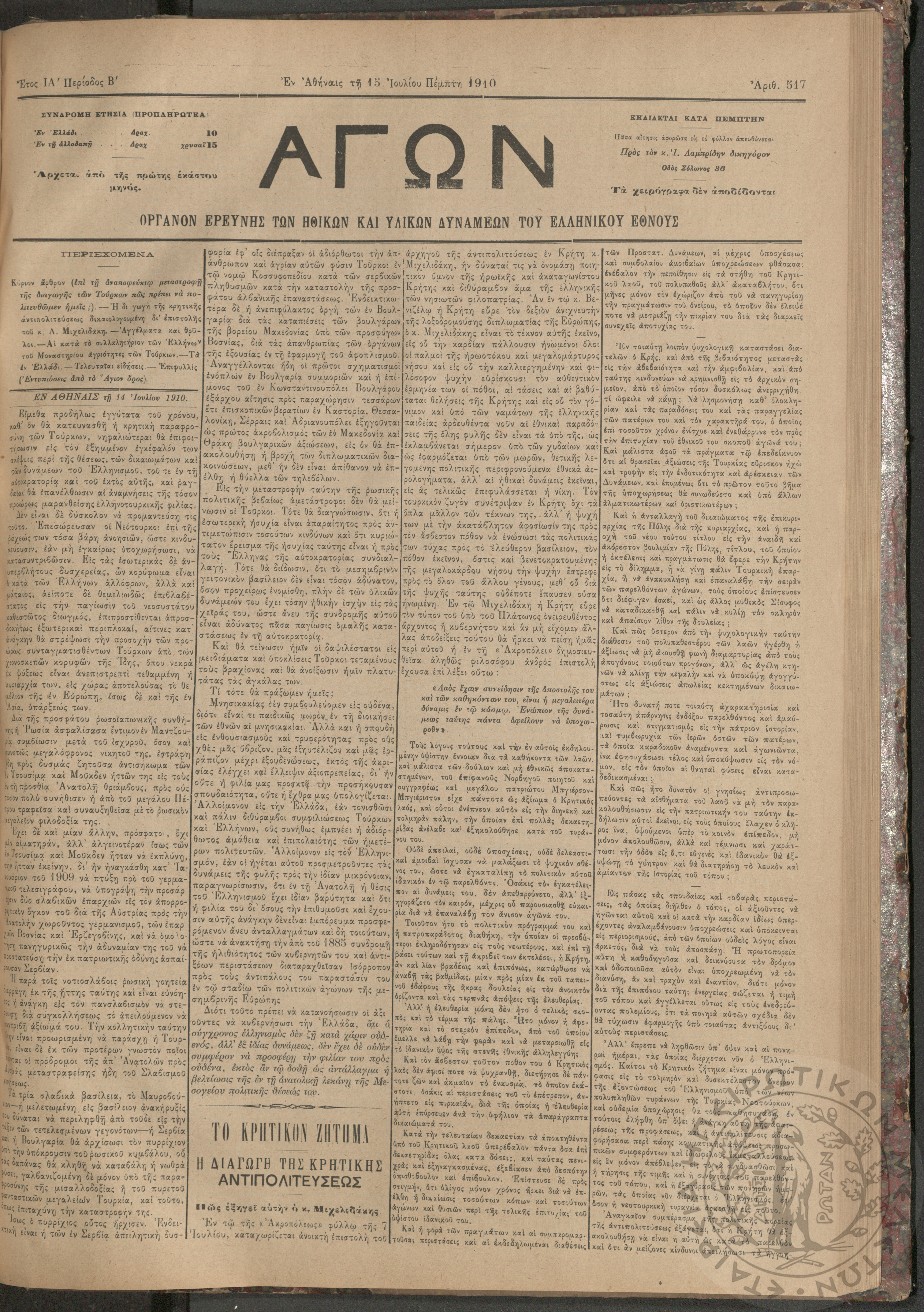 Αγών: Όργανον ερεύνης των ηθικών και υλικών δυνάμεων του Ελληνικού Έθνους, 1910 (Φ. 517)Έτος ΙΑ΄, Φ. 517...