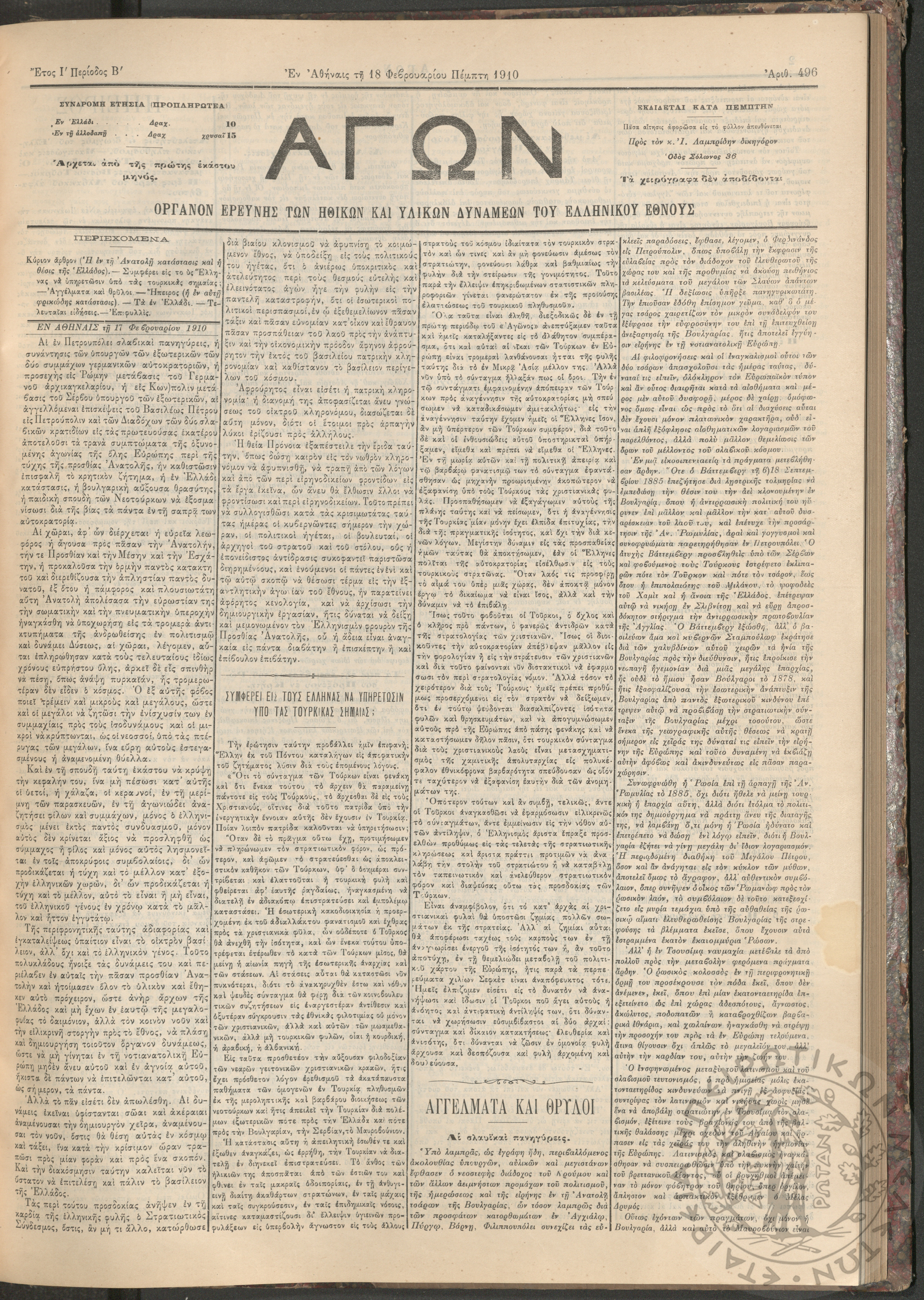 Αγών: Όργανον ερεύνης των ηθικών και υλικών δυνάμεων του Ελληνικού Έθνους, 1910 (Φ. 496)Έτος Ι΄, Φ. 496...