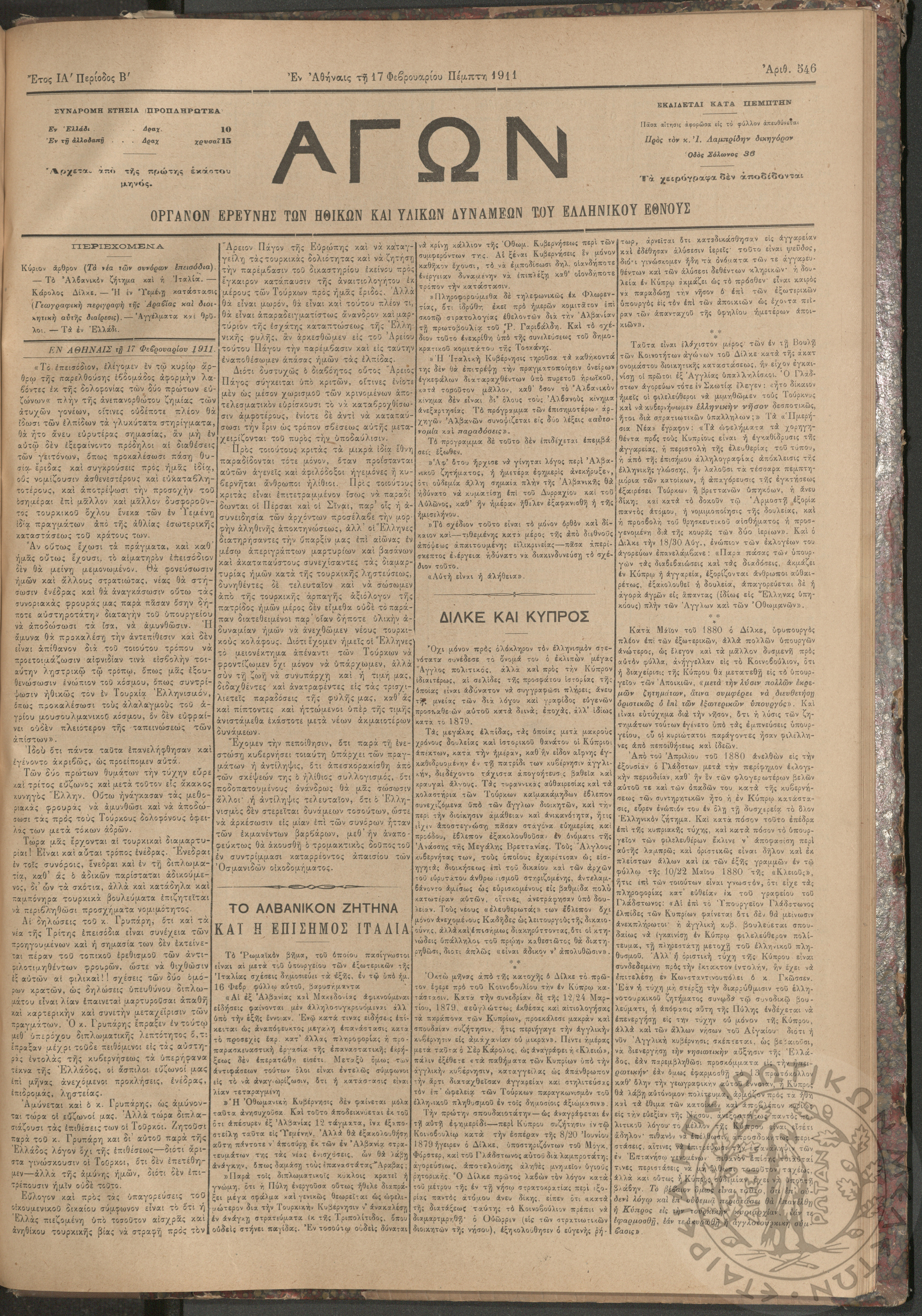 Αγών: Όργανον ερεύνης των ηθικών και υλικών δυνάμεων του Ελληνικού Έθνους, 1911 (Φ. 546)Έτος ΙΑ΄, Περίοδος Β', Φ.546...