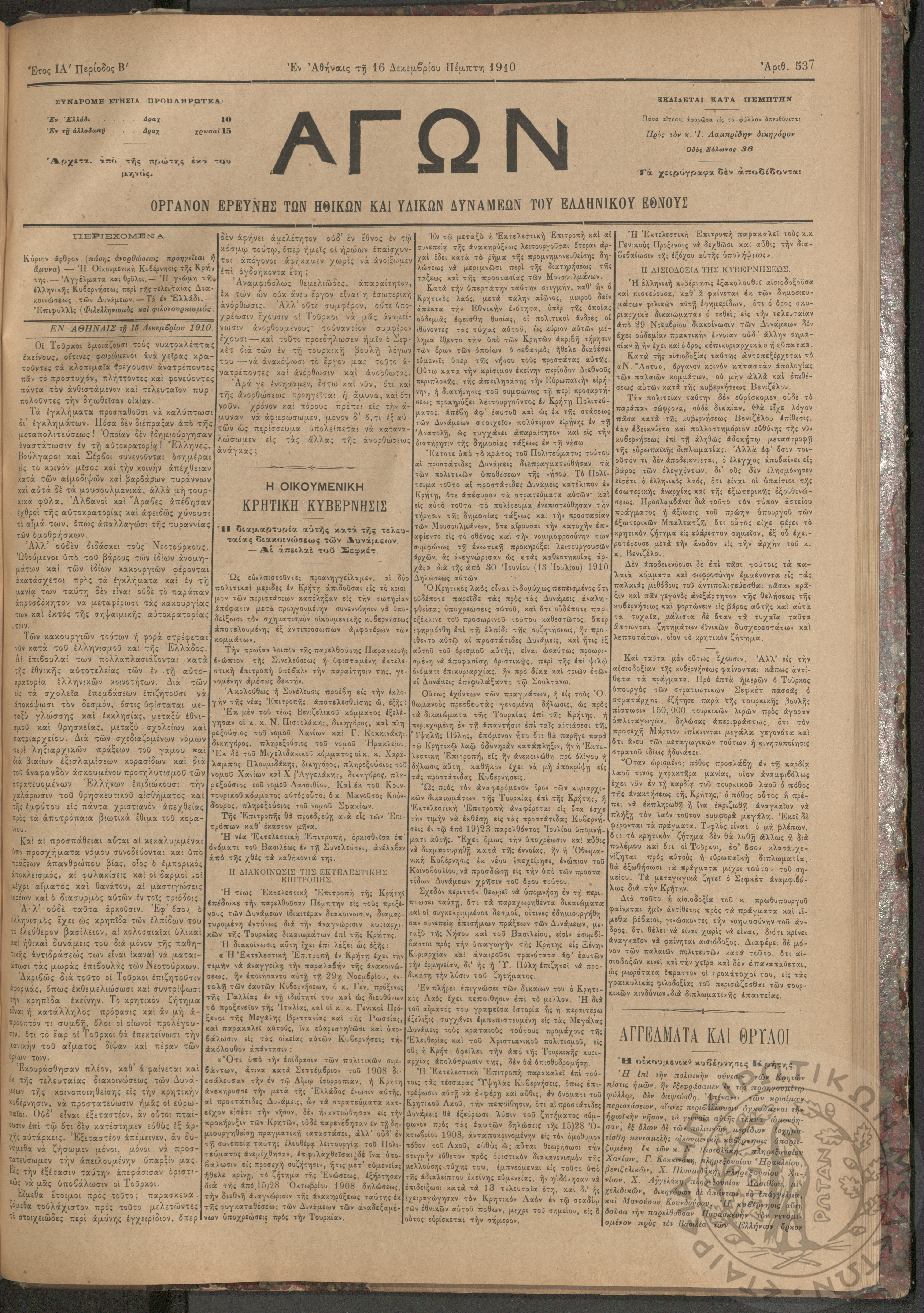 Αγών: Όργανον ερεύνης των ηθικών και υλικών δυνάμεων του Ελληνικού Έθνους, 1910 (Φ. 537)Έτος ΙΑ΄, Φ. 537...