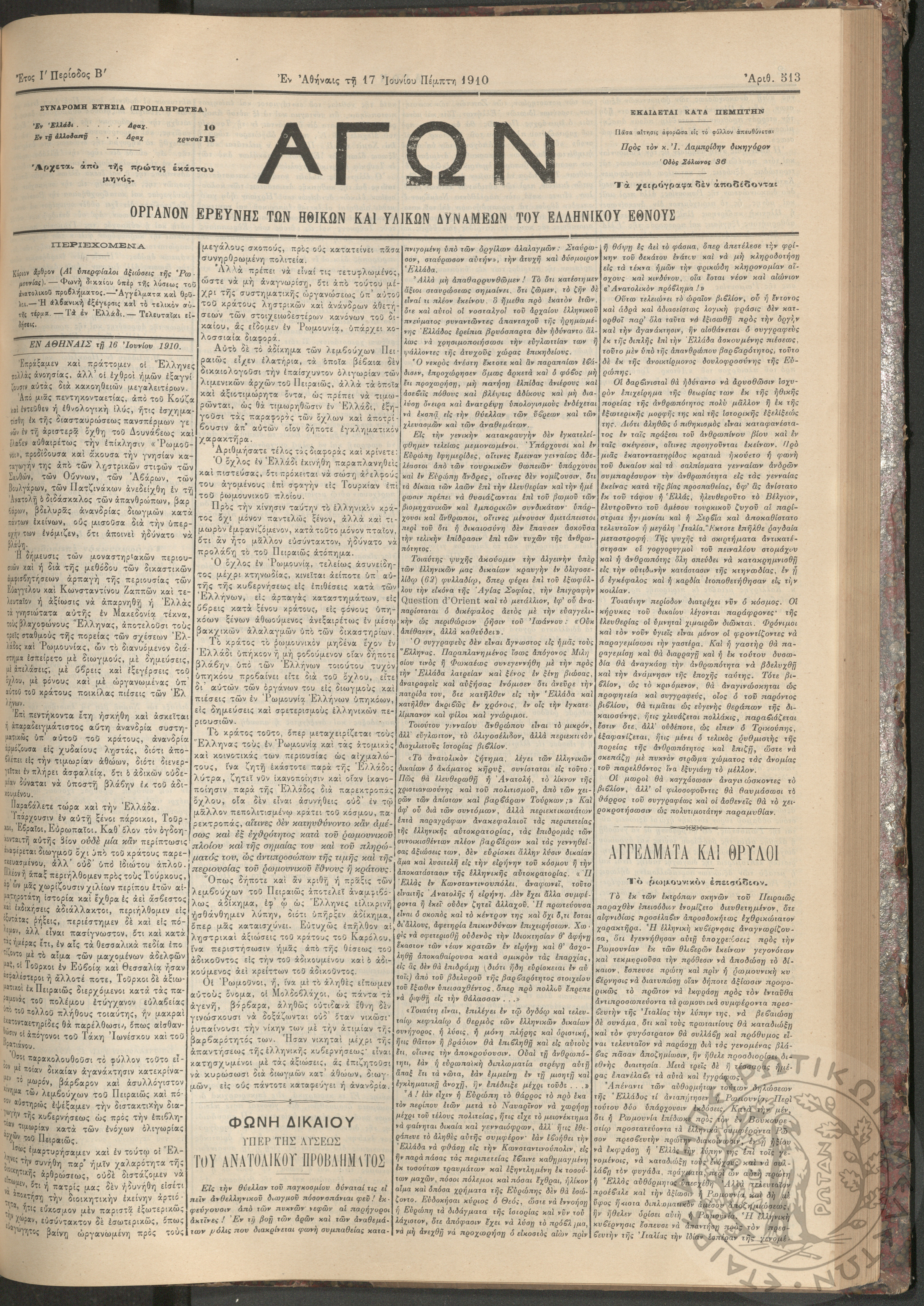 Αγών: Όργανον ερεύνης των ηθικών και υλικών δυνάμεων του Ελληνικού Έθνους, 1910 (Φ. 513)Έτος Ι΄, Φ. 513...