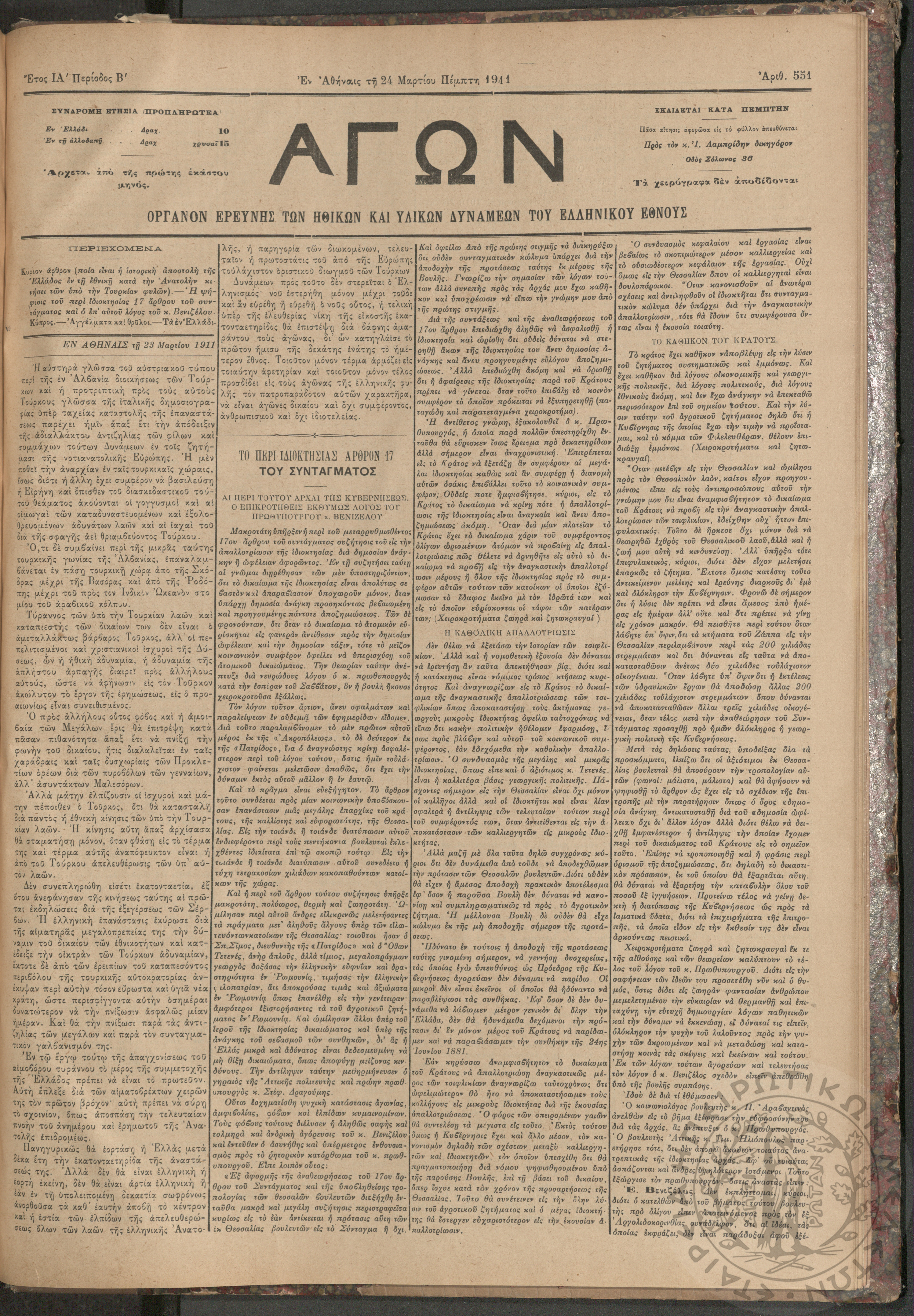 Αγών: Όργανον ερεύνης των ηθικών και υλικών δυνάμεων του Ελληνικού Έθνους, 1911 (Φ. 551)Έτος ΙΑ΄, Περίοδος Β', Φ.551...