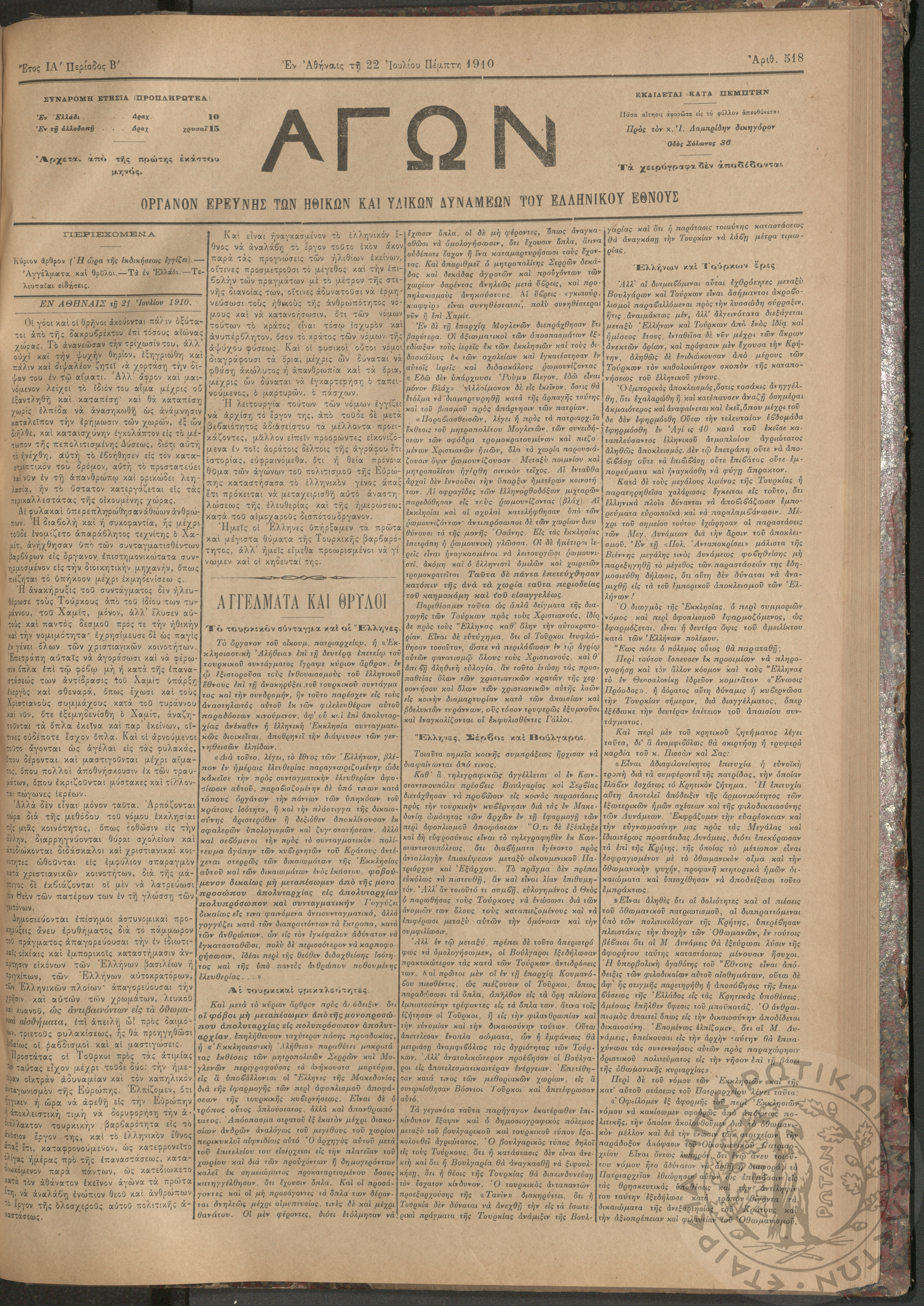 Αγών: Όργανον ερεύνης των ηθικών και υλικών δυνάμεων του Ελληνικού Έθνους, 1910 (Φ. 518)Έτος ΙΑ΄, Φ. 518...