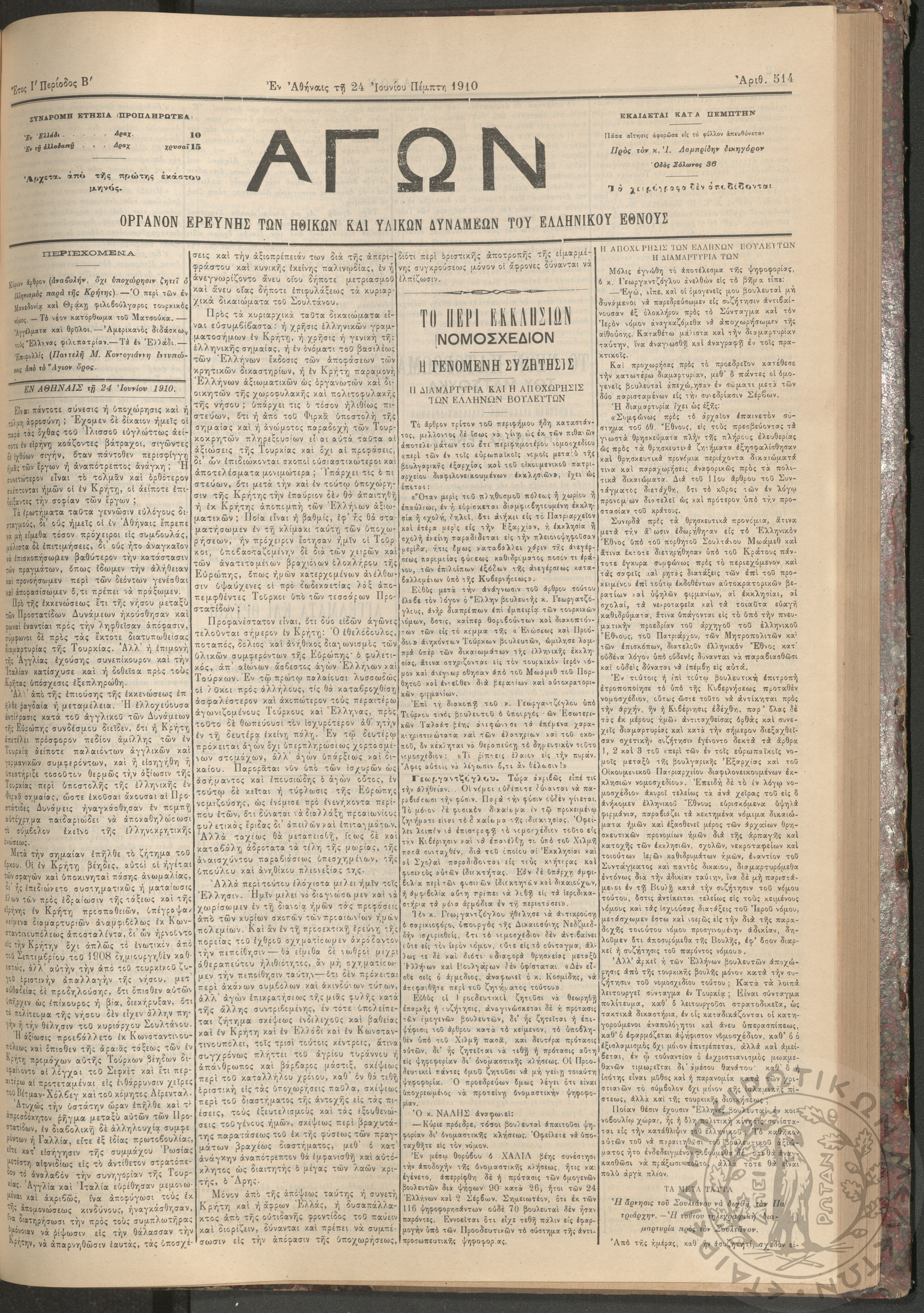 Αγών: Όργανον ερεύνης των ηθικών και υλικών δυνάμεων του Ελληνικού Έθνους, 1910 (Φ. 514)Έτος Ι΄, Φ. 514...
