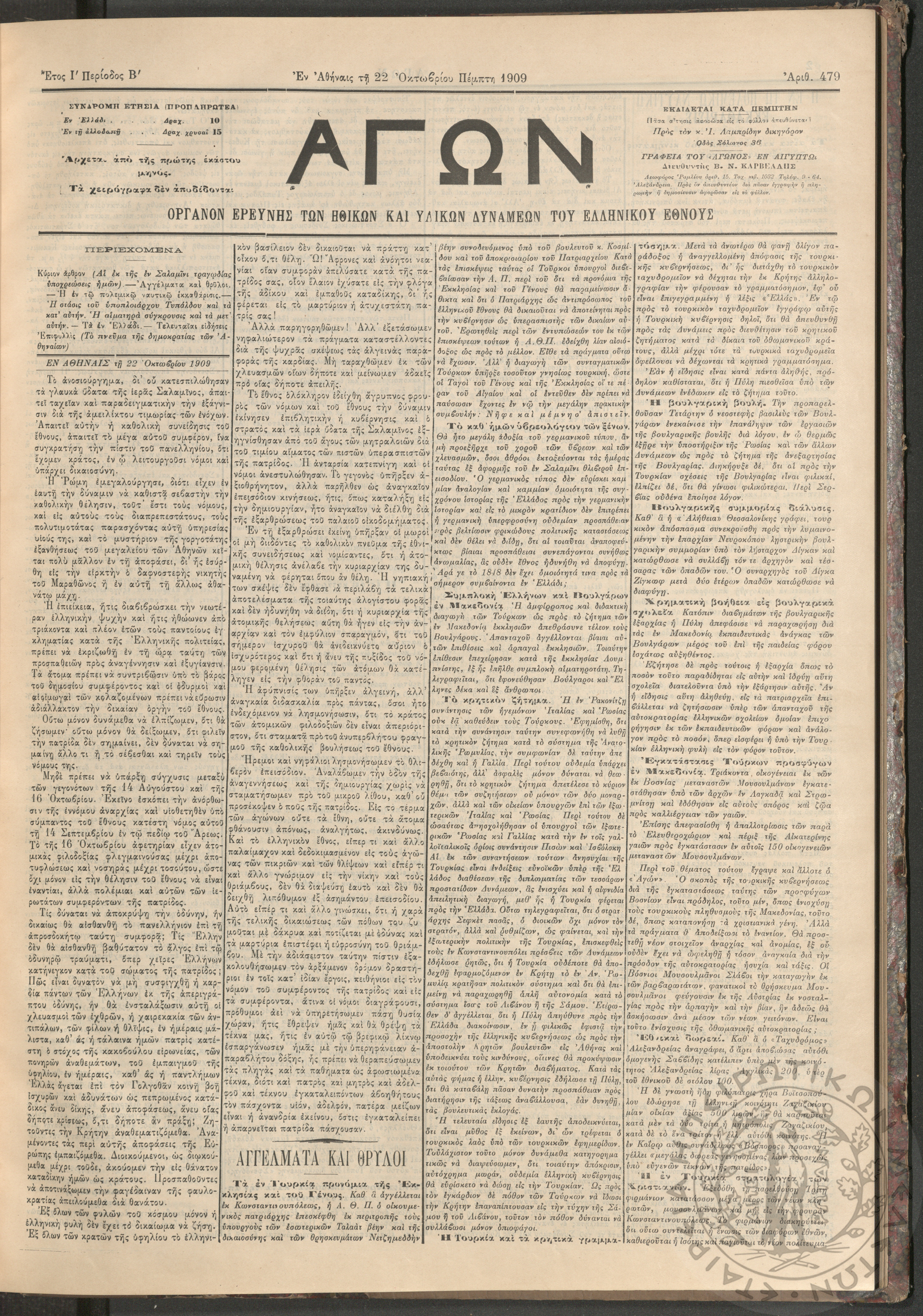 Αγών: Όργανον ερεύνης των ηθικών και υλικών δυνάμεων του Ελληνικού Έθνους, 1909 (Φ. 479)Έτος Ι΄, Φ. 479...