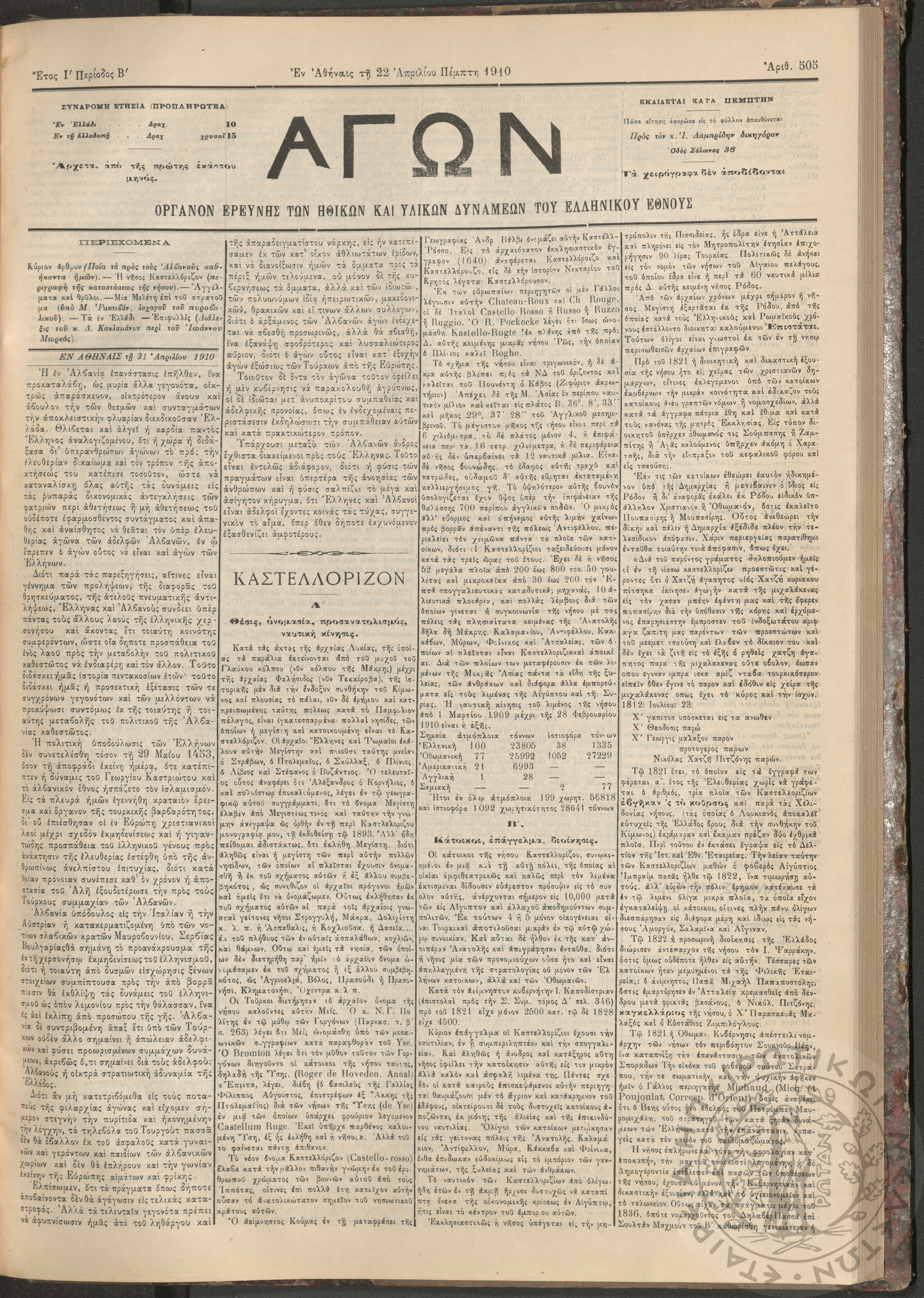 Αγών: Όργανον ερεύνης των ηθικών και υλικών δυνάμεων του Ελληνικού Έθνους, 1910 (Φ. 505)Έτος Ι΄, Φ. 505...
