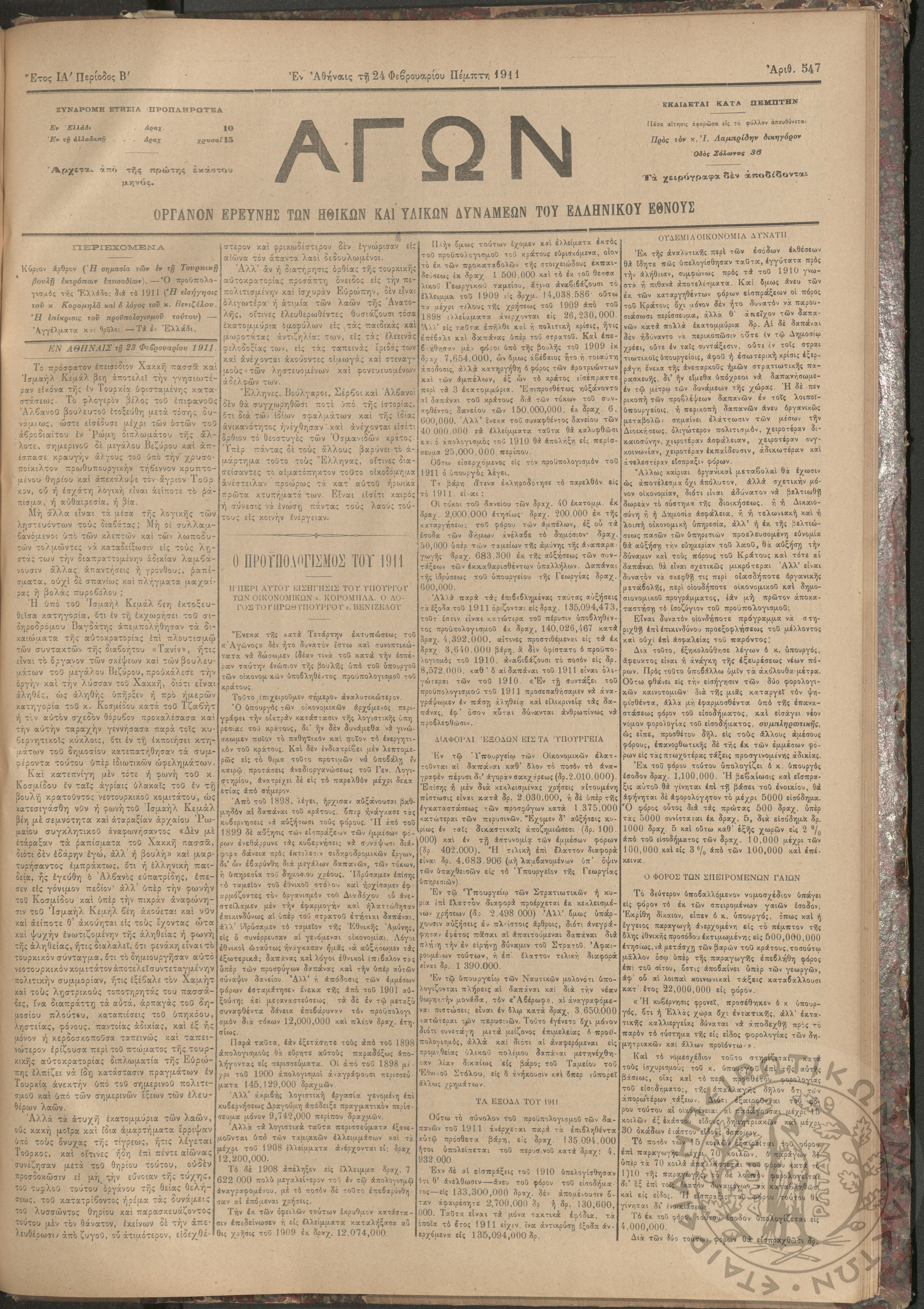 Αγών: Όργανον ερεύνης των ηθικών και υλικών δυνάμεων του Ελληνικού Έθνους, 1911 (Φ. 547)Έτος ΙΑ΄, Περίοδος Β', Φ.547...