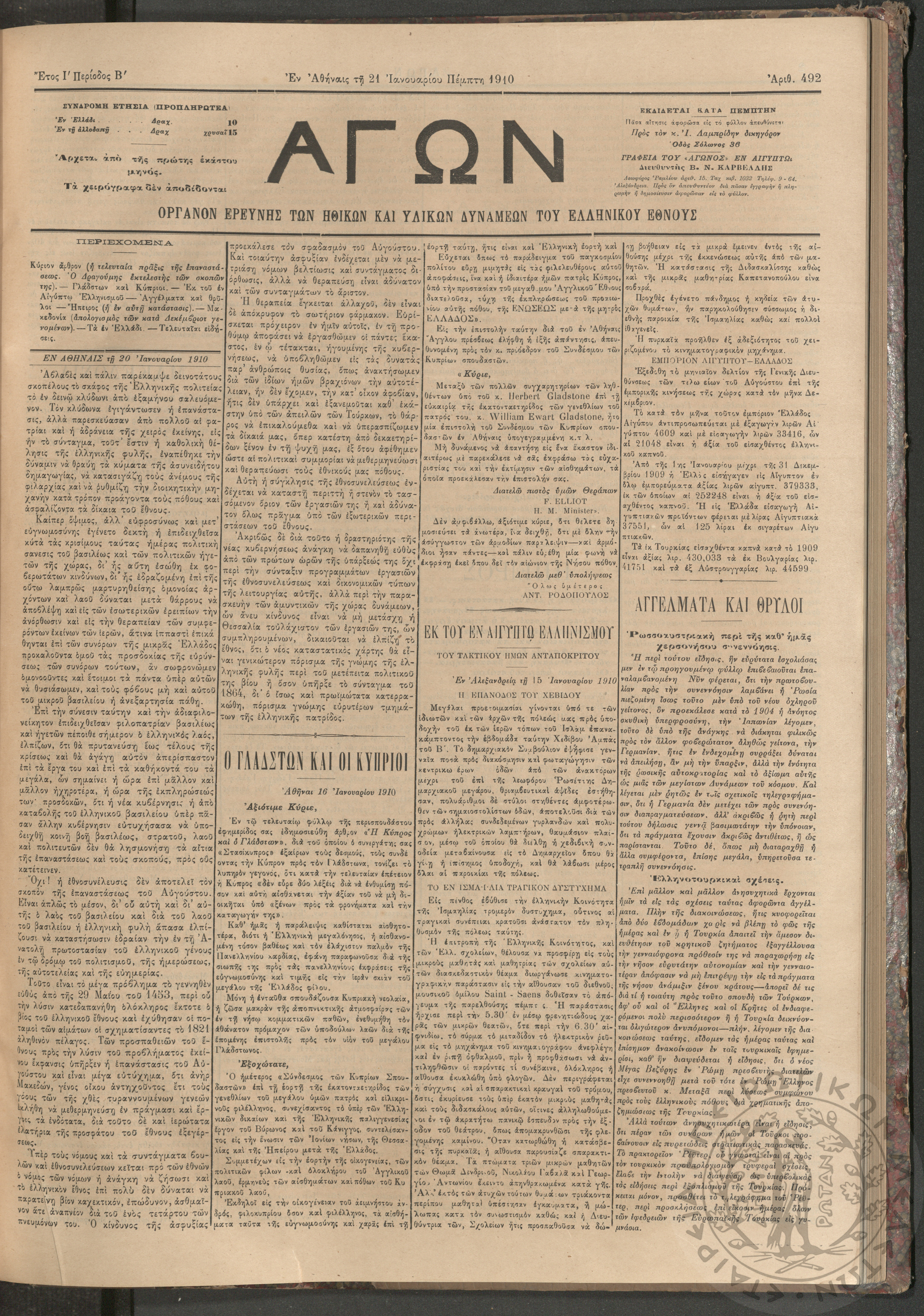 Αγών: Όργανον ερεύνης των ηθικών και υλικών δυνάμεων του Ελληνικού Έθνους, 1910 (Φ. 492)Έτος Ι΄, Φ. 492...