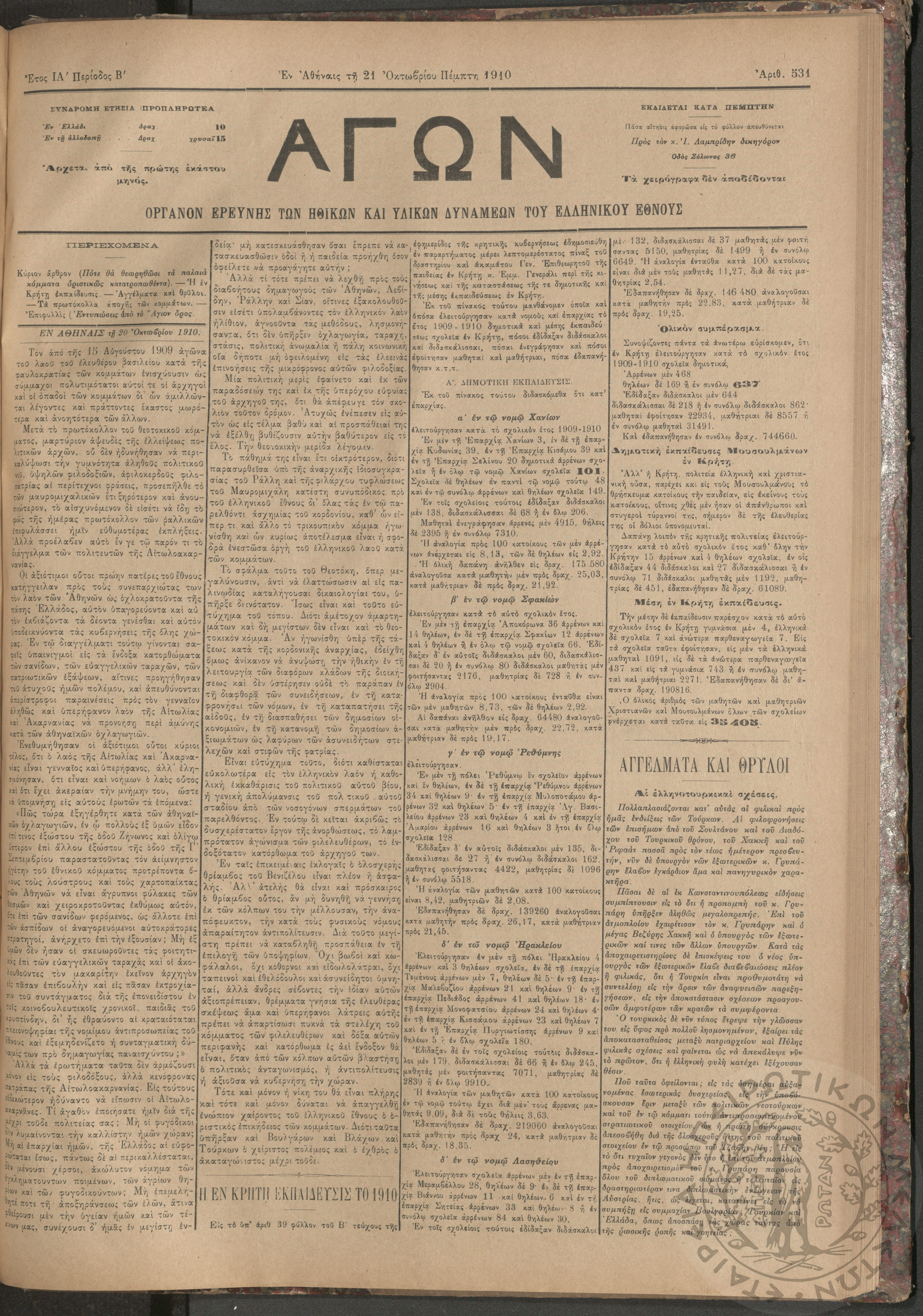 Αγών: Όργανον ερεύνης των ηθικών και υλικών δυνάμεων του Ελληνικού Έθνους, 1910 (Φ. 531)Έτος ΙΑ΄, Φ.531...