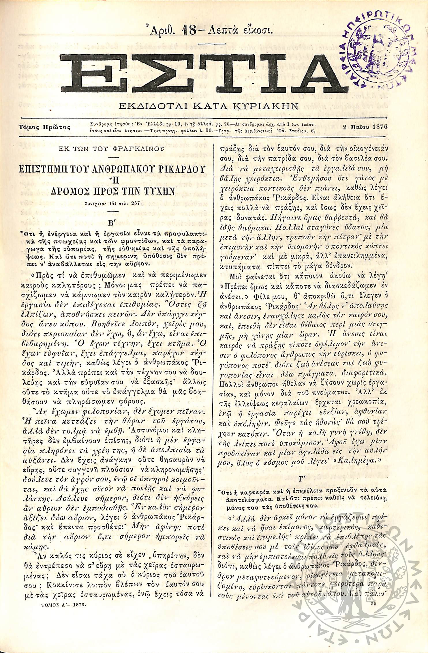 Ο Αιών: μηνιαίον περιοδικόν πολιτικής οικονομικής και κοινωνικής έρευνης (τεύχ. 18) / The Century: with an English supplement (vol. 18)Έτος Β', τεύχ. 18...