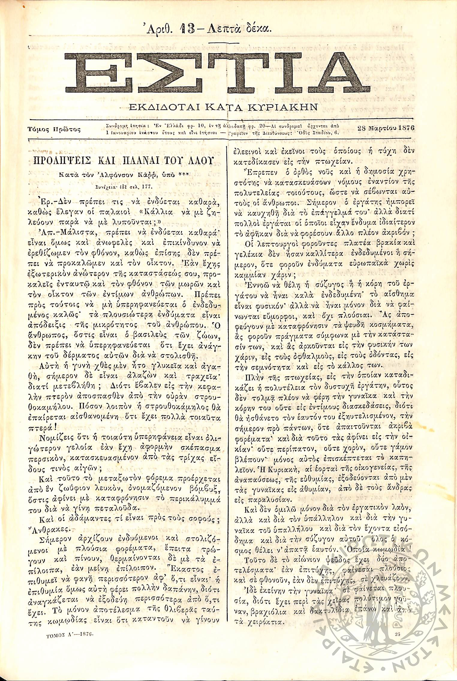 Ο Αιών: μηνιαίον περιοδικόν πολιτικής οικονομικής και κοινωνικής έρευνης (τεύχ. 13)Έτος Β', τεύχ. 13...