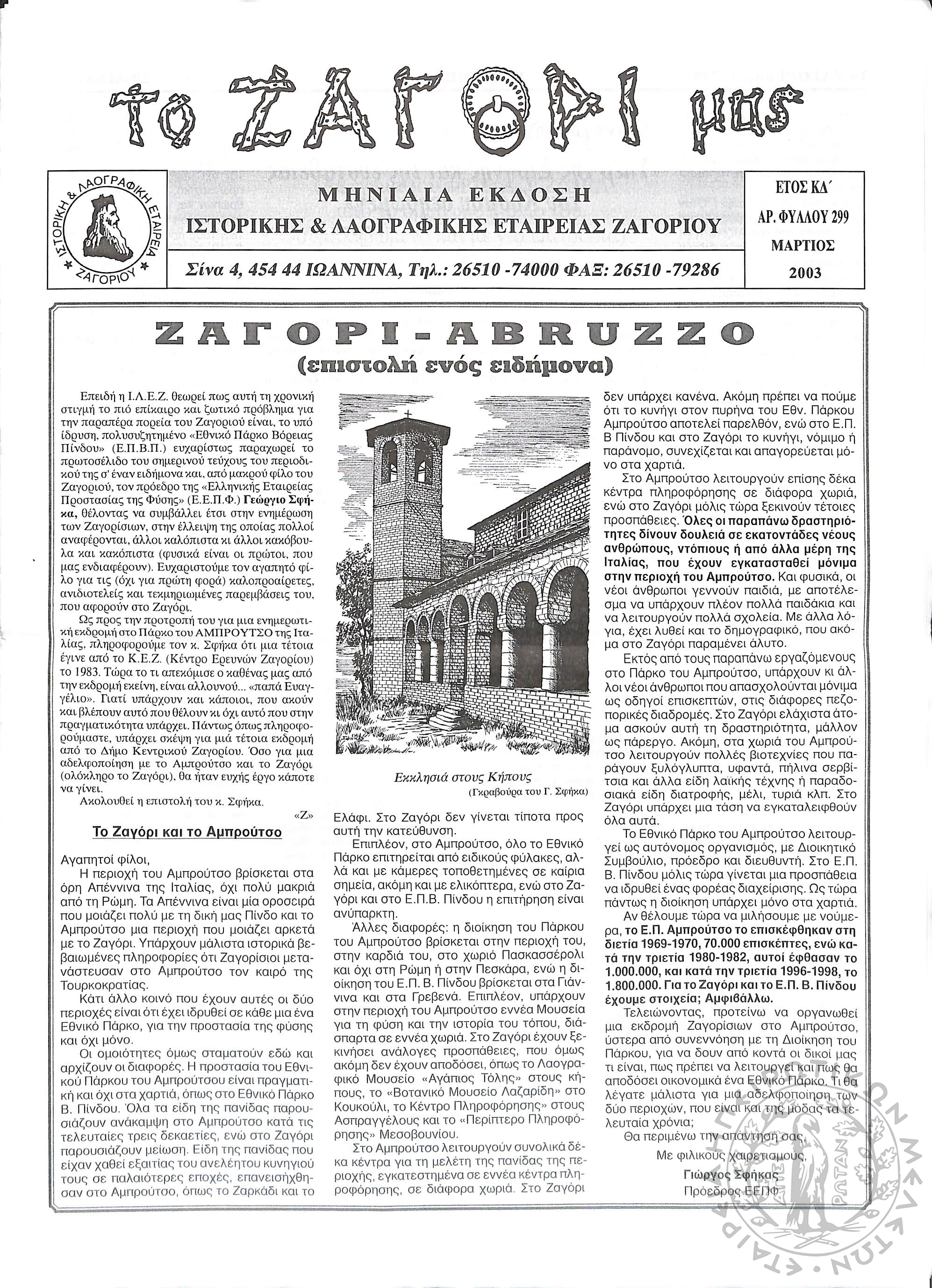 Το Ζαγόρι μας: μηνιαία έκδοση Ιστορικής και Λαογραφικής Εταιρείας Ζαγορίου (φ. 299)Έτος ΚΔ΄, φ. 299...