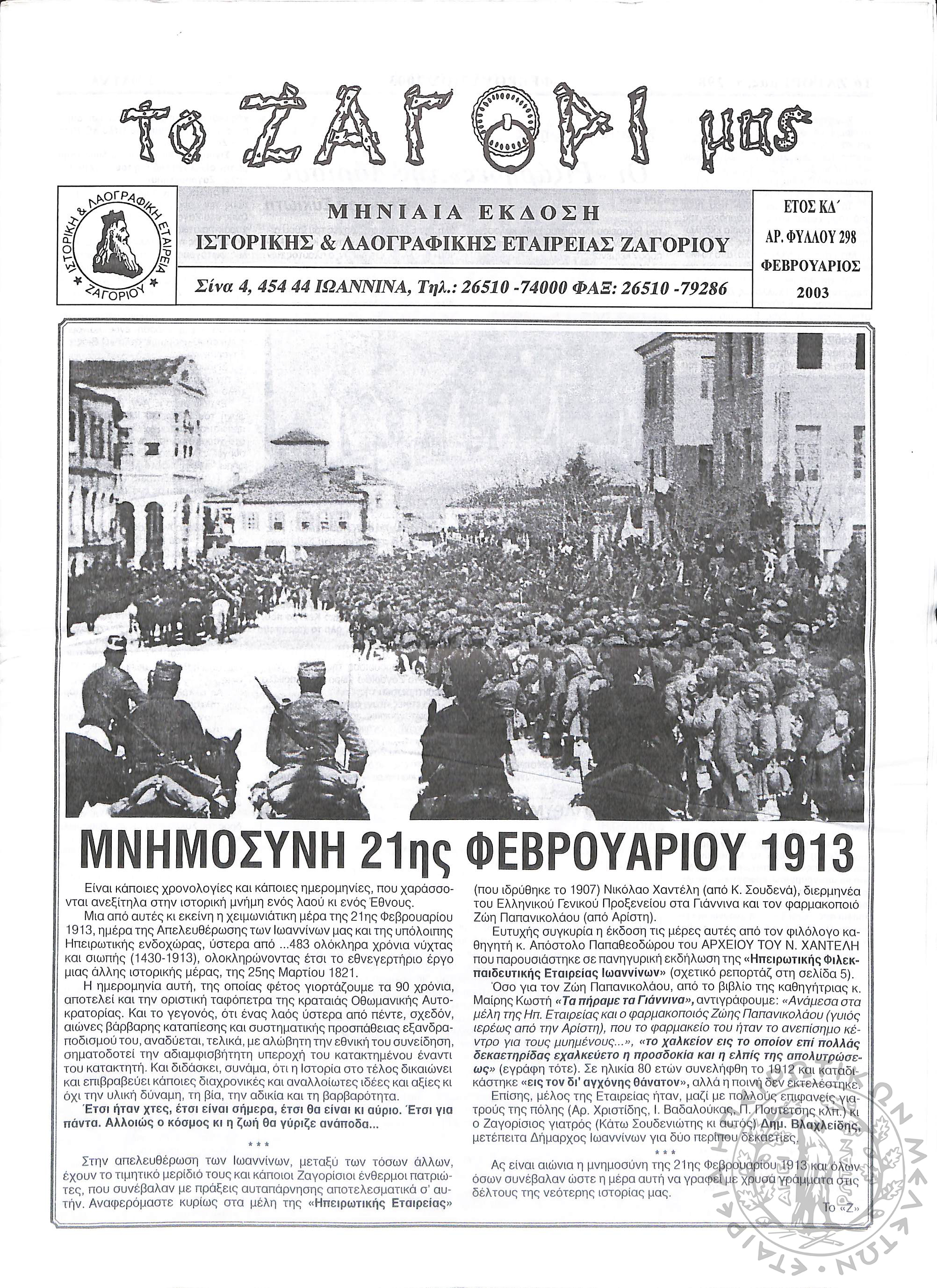 Το Ζαγόρι μας: μηνιαία έκδοση Ιστορικής και Λαογραφικής Εταιρείας Ζαγορίου (φ. 298)Έτος ΚΔ΄, φ. 298...