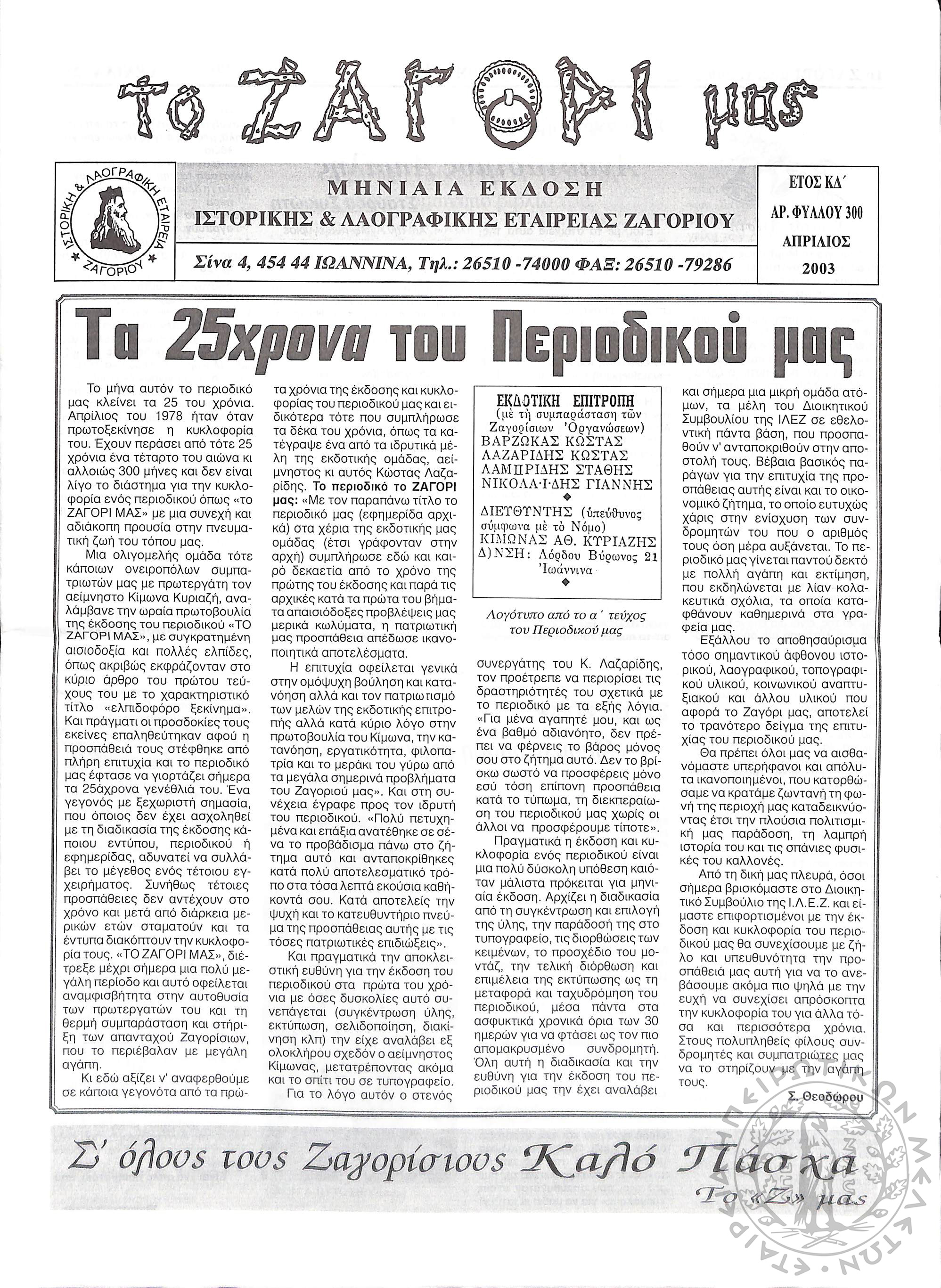 Το Ζαγόρι μας: μηνιαία έκδοση Ιστορικής και Λαογραφικής Εταιρείας Ζαγορίου (φ. 300)Έτος ΚΔ΄, φ. 300...