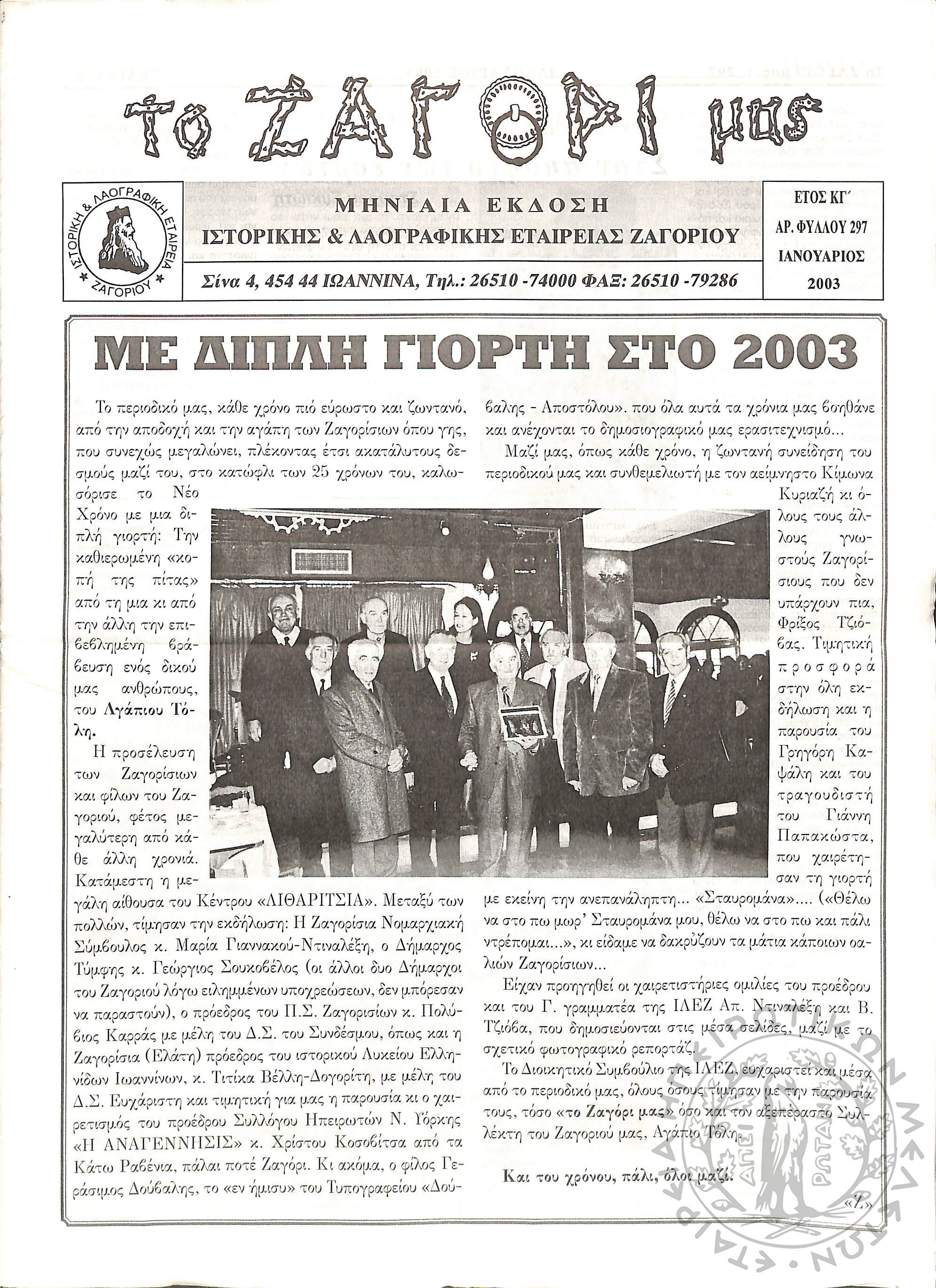 Το Ζαγόρι μας: μηνιαία έκδοση Ιστορικής και Λαογραφικής Εταιρείας Ζαγορίου (φ. 297)Έτος ΚΓ΄, φ. 297...