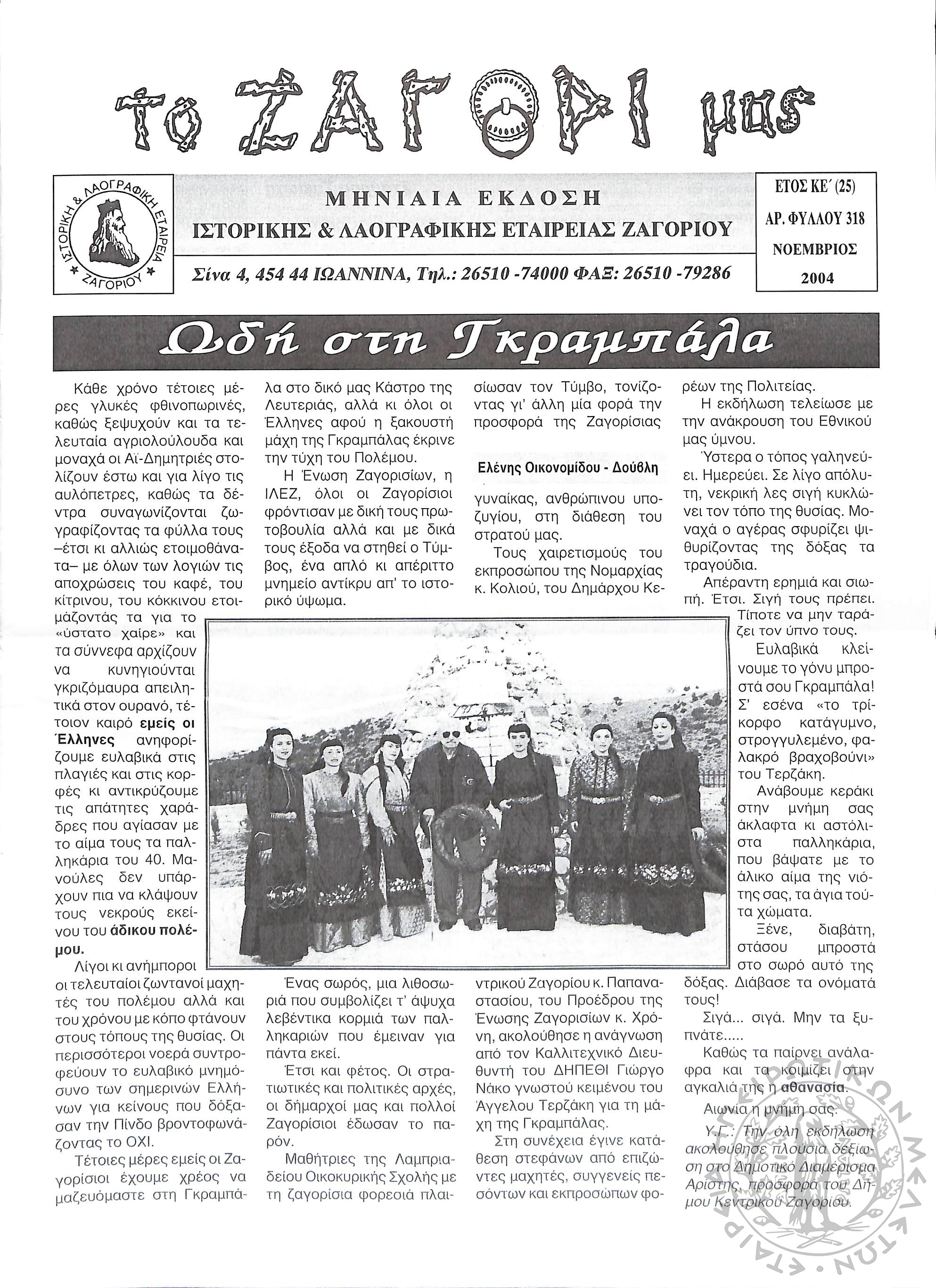 Το Ζαγόρι μας: μηνιαία έκδοση Ιστορικής και Λαογραφικής Εταιρείας Ζαγορίου (φ. 318)Έτος ΚΕ΄, φ. 318...