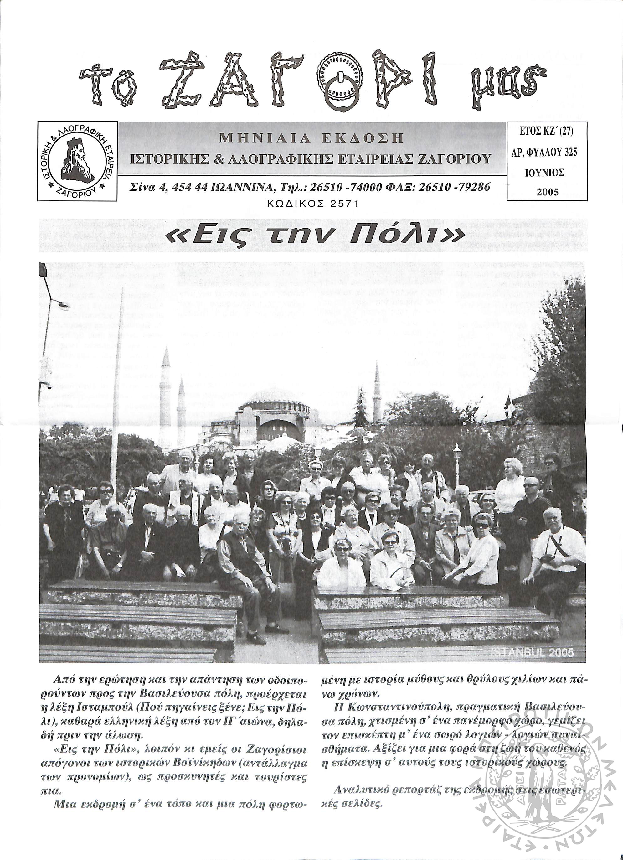 Το Ζαγόρι μας: μηνιαία έκδοση Ιστορικής και Λαογραφικής Εταιρείας Ζαγορίου (φ. 325)Έτος ΚΖ΄, φ. 325...