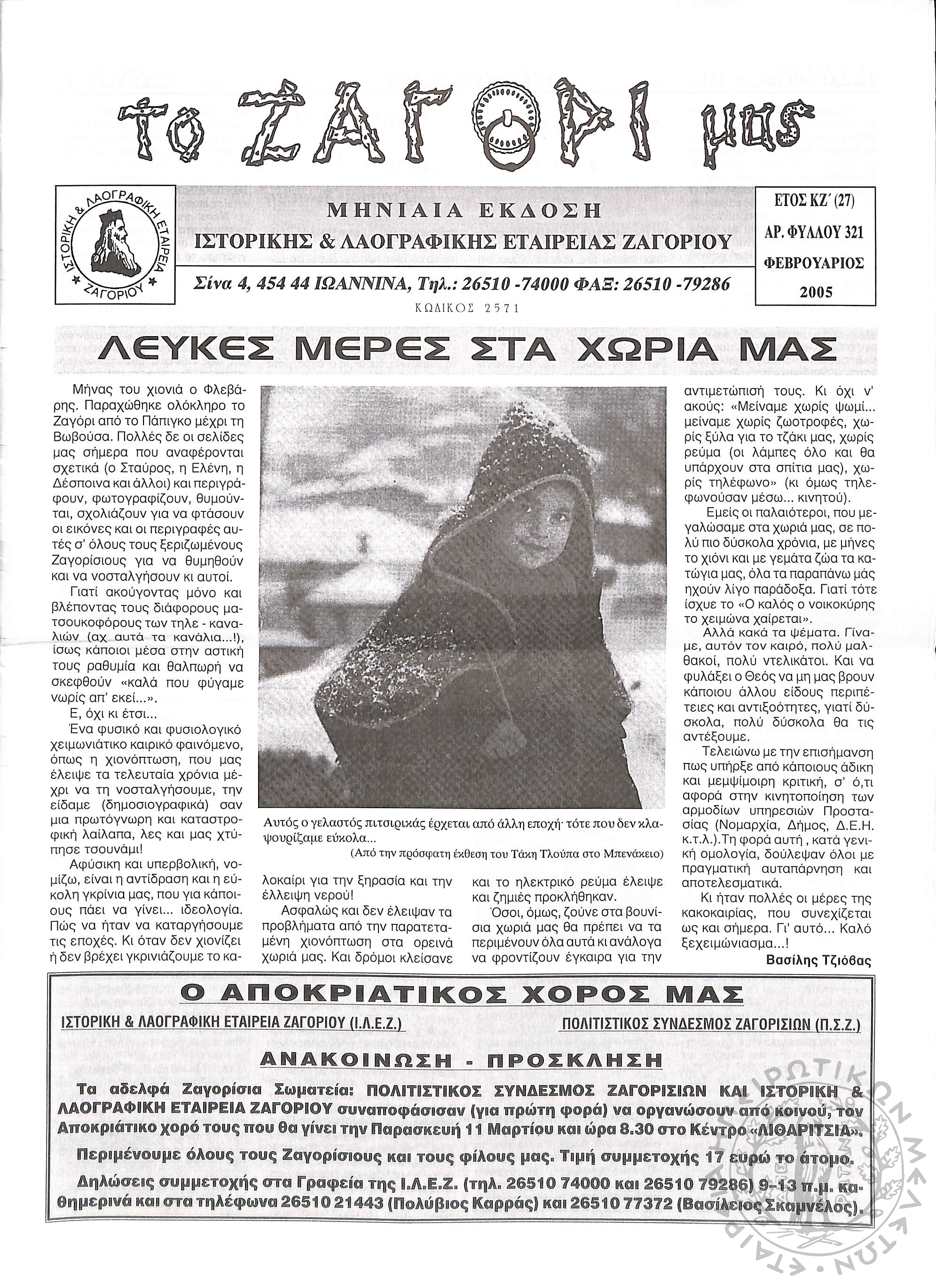 Το Ζαγόρι μας: μηνιαία έκδοση Ιστορικής και Λαογραφικής Εταιρείας Ζαγορίου (φ. 321)Έτος ΚΖ΄, φ. 321...