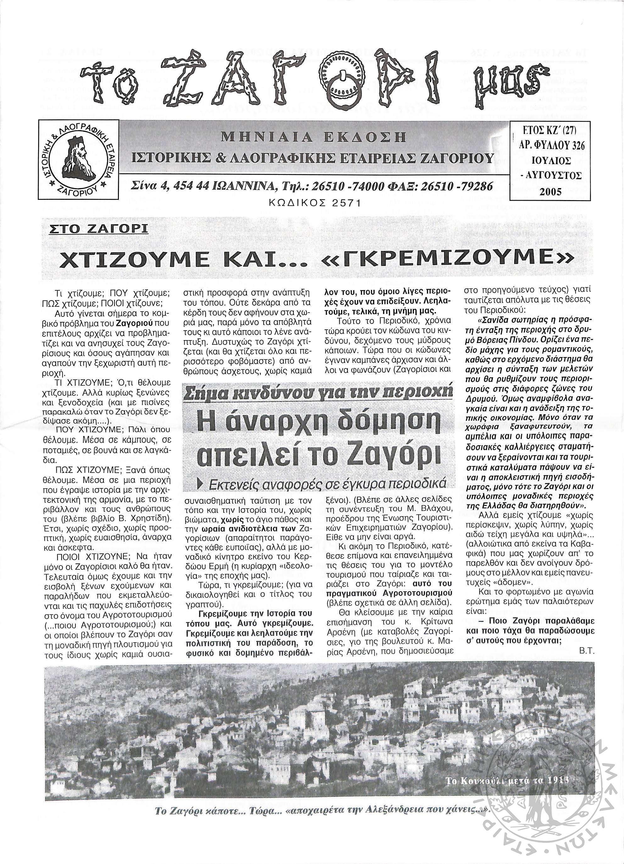 Το Ζαγόρι μας: μηνιαία έκδοση Ιστορικής και Λαογραφικής Εταιρείας Ζαγορίου (φ. 326)Έτος ΚΖ΄, φ. 326...