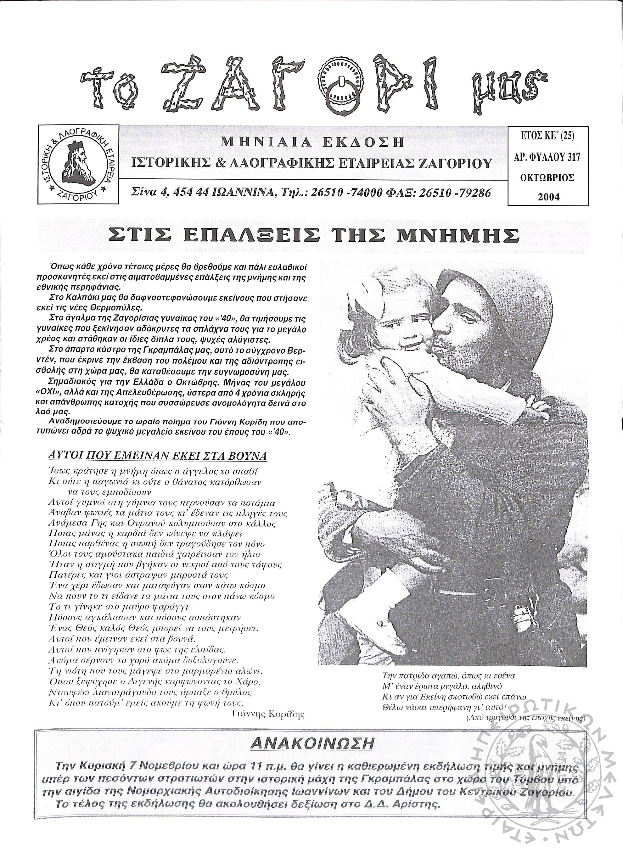 Το Ζαγόρι μας: μηνιαία έκδοση Ιστορικής και Λαογραφικής Εταιρείας Ζαγορίου (φ. 317)Έτος ΚΕ΄, φ. 317...