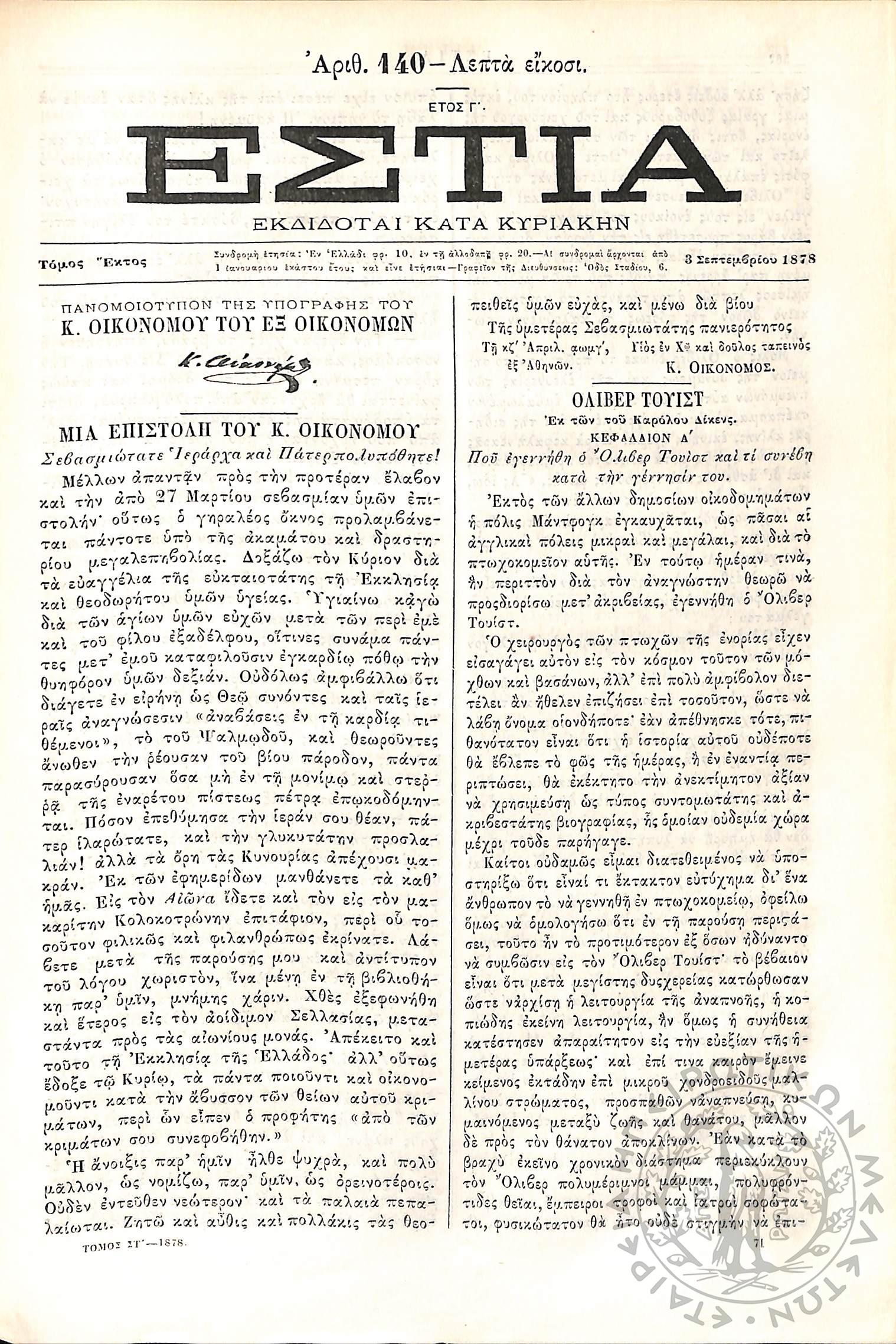 Εστία : Εκδίδοται κατά Κυριακήν - Τόμ. 6 / τχ. 140
