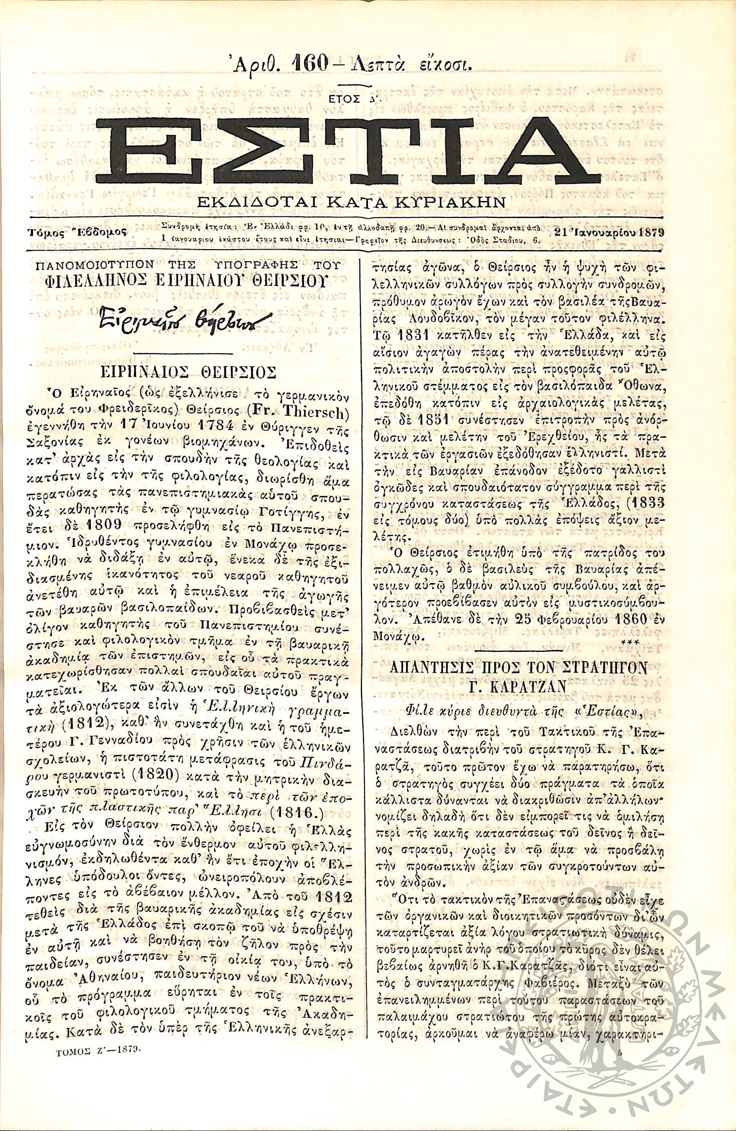 Εστία : Εκδίδοται κατά Κυριακήν - Τόμ. 7 / τχ. 160