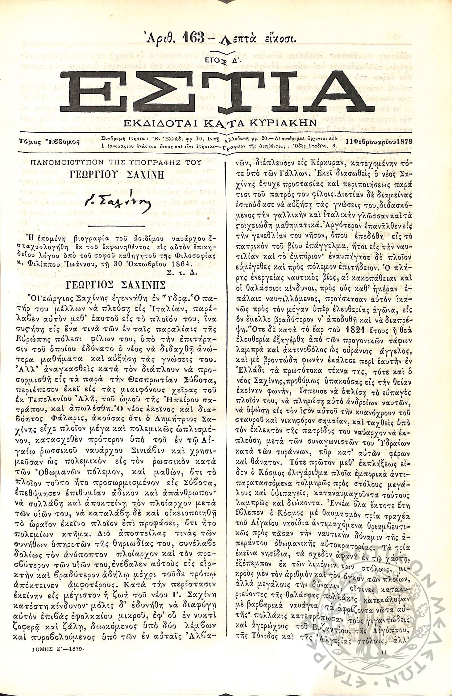 Εστία : Εκδίδοται κατά Κυριακήν - Τόμ. 7 / τχ. 163