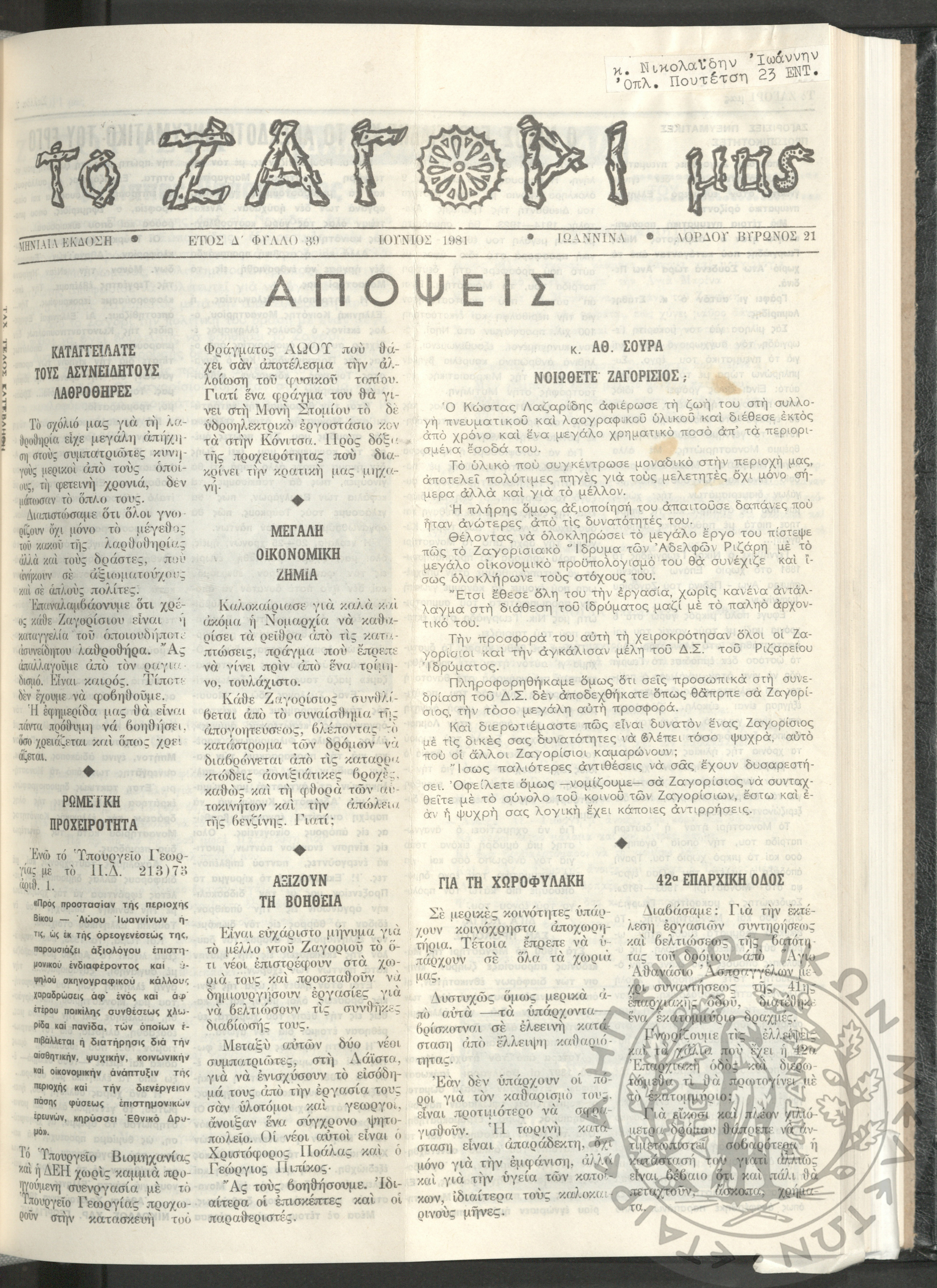 Το Ζαγόρι μας: μηνιαία έκδοση, 1981, φ. 39