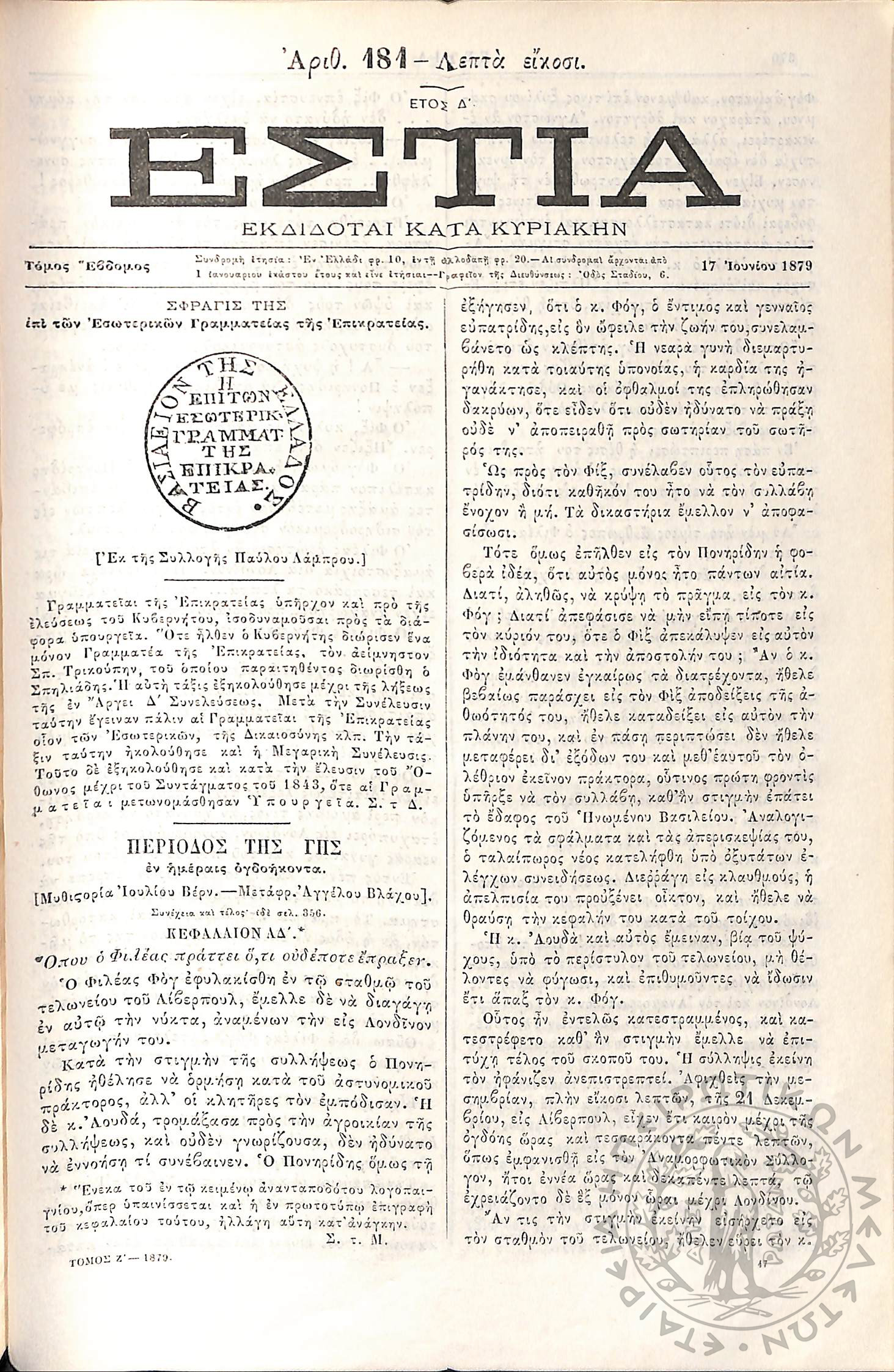 Εστία : Εκδίδοται κατά Κυριακήν - Τόμ. 7 / τχ. 181