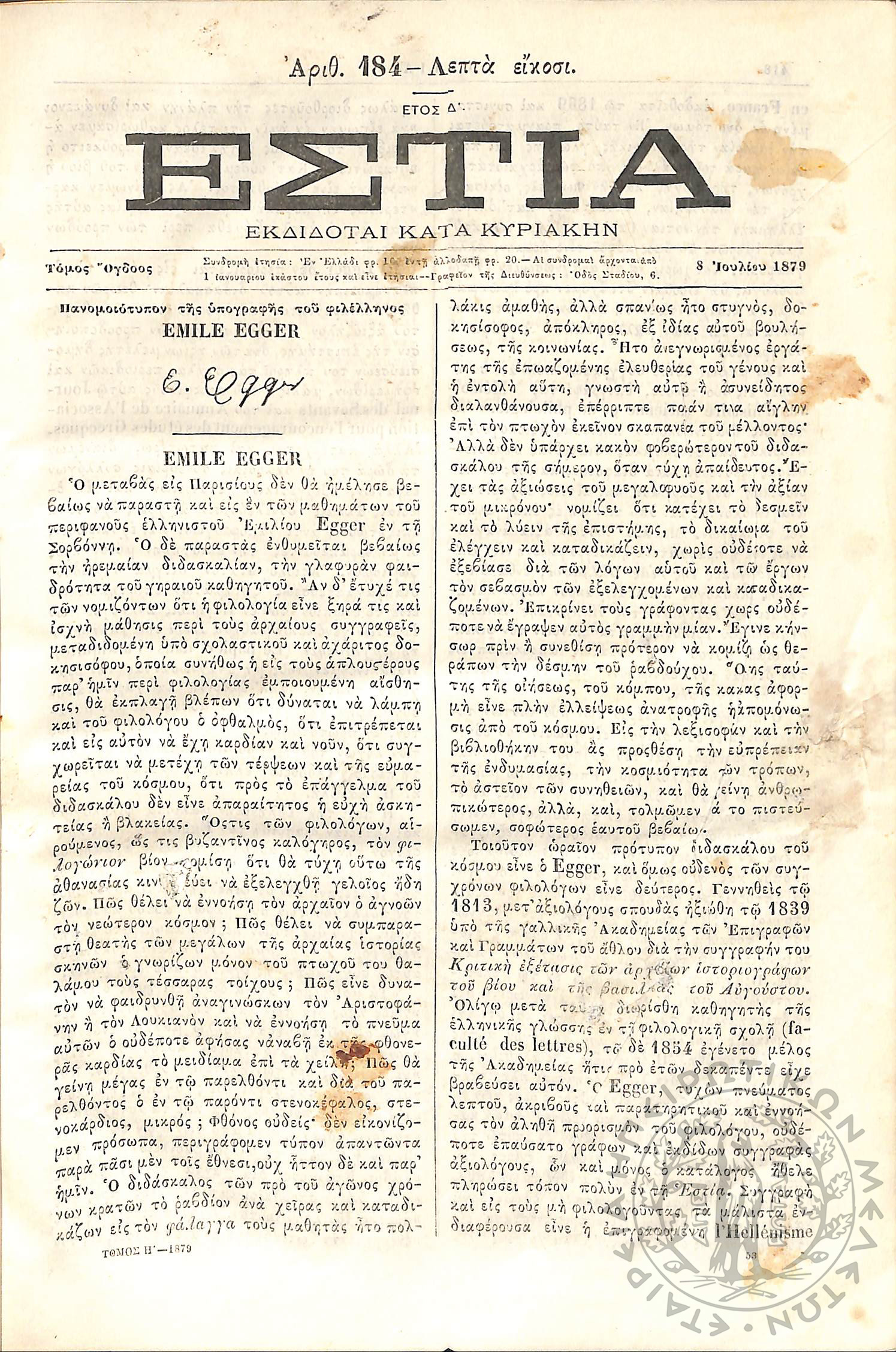 Εστία : Εκδίδοται κατά Κυριακήν - Τόμ. 8 / τχ. 184