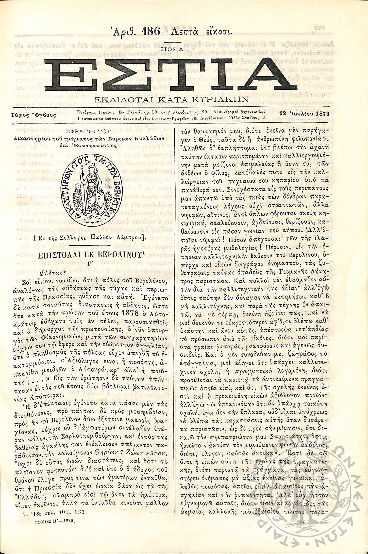 Εστία : Εκδίδοται κατά Κυριακήν - Τόμ. 8 / τχ. 186