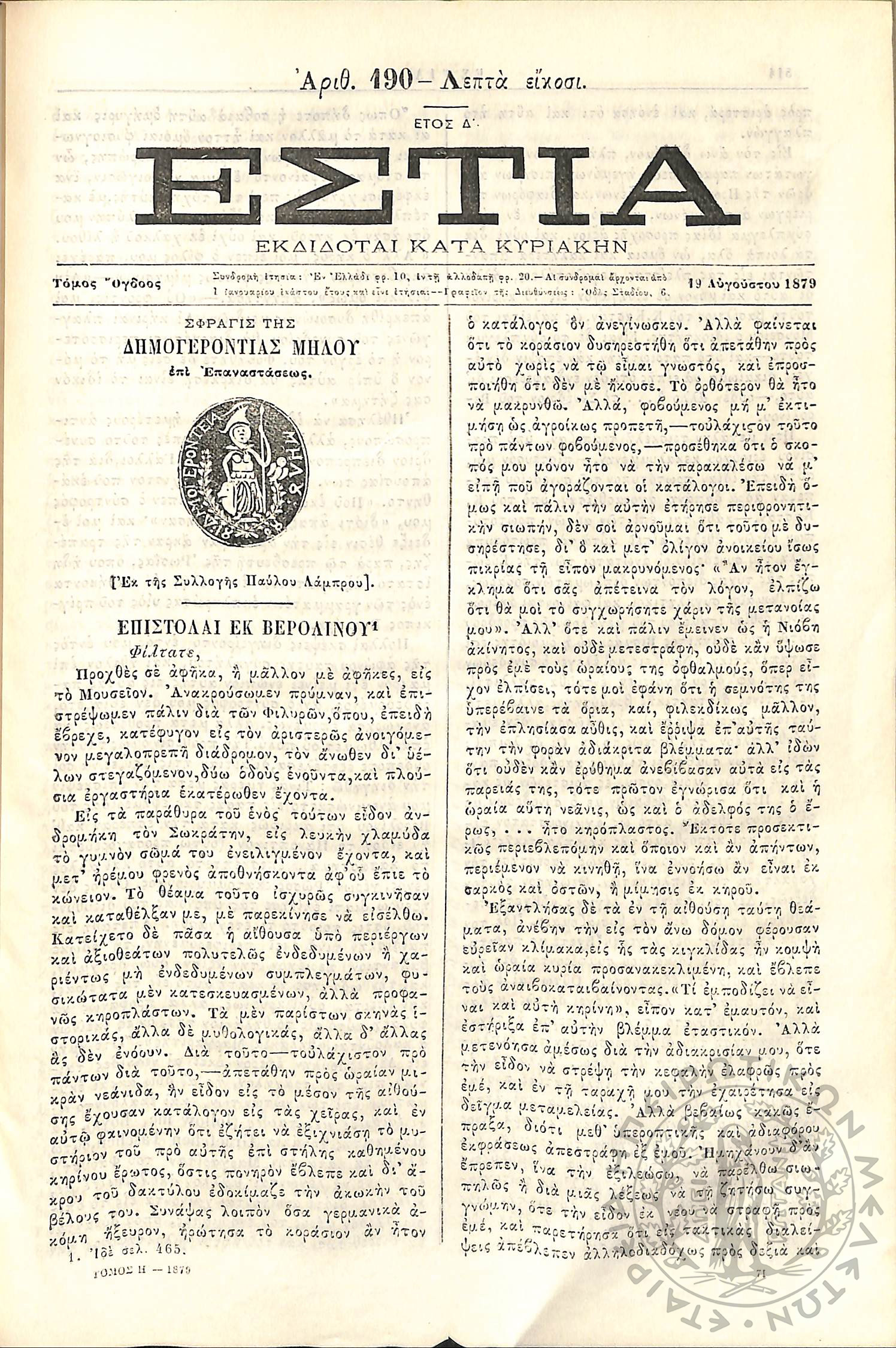 Εστία : Εκδίδοται κατά Κυριακήν - Τόμ. 8 / τχ. 190